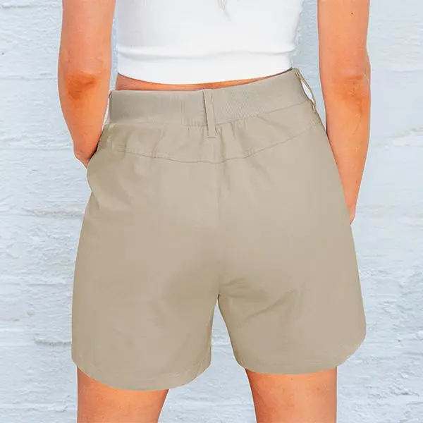 This pair of womens shorts casual featuring a high-rise waist, partially elasticized waist design, button closure and zip fly.