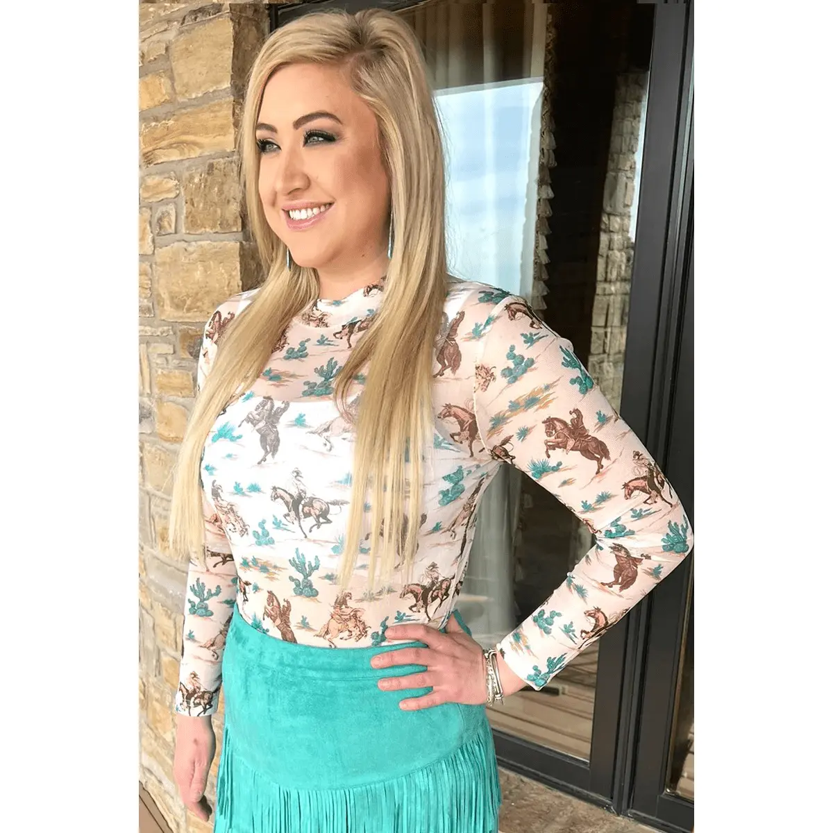 Slip on the Chisholm Trail Top and hit the open road! This thin mesh top is great for layering, so you can flee the nine-to-five without ever feeling weighed down. These top features broncs, cowboys and cactus pattern.