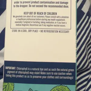 Mulberry-Derived Chlorophyll: These drops contain Chlorophyllin, the water-soluble form derived from natural chlorophyll. Chlorophyll is a natural dye and as such the natural green pigment of chlorophyll may stain. Make sure to use caution when taking this product so as to preserve your clothes and surroundings!
