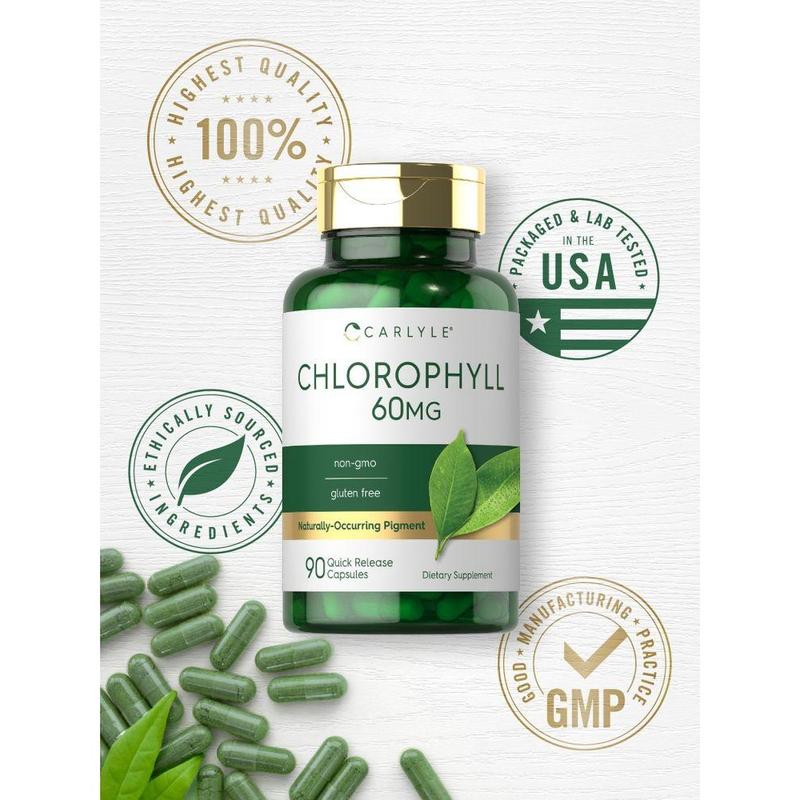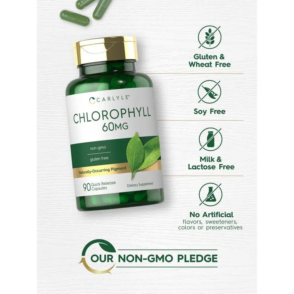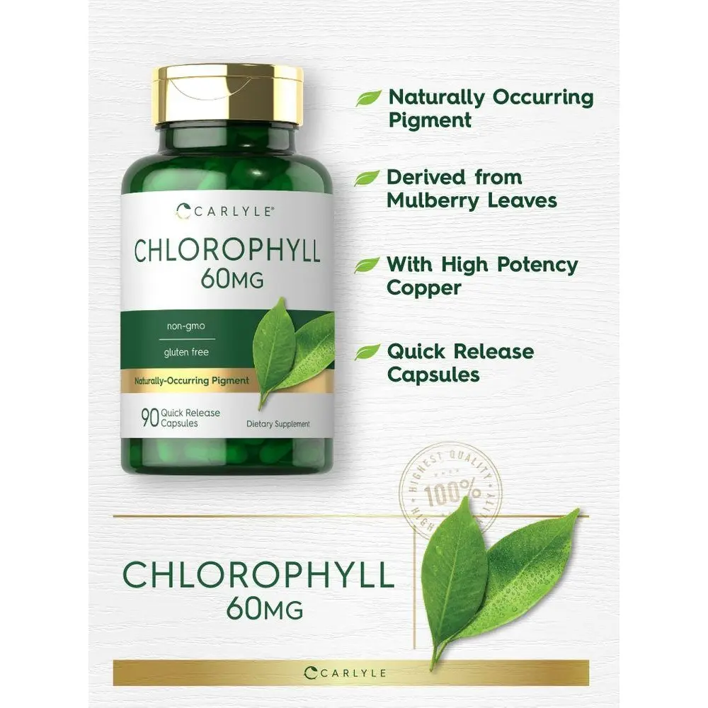 At Carlyle, our advanced supplement features 60 mg of Chlorophyll from Mulberry leaves (as Sodium Copper Chlorophyllin) in convenient quick release capsules. This green pigment has naturally occurring vitamins and minerals and is popular for both men and women. It's non-GMO and gluten free, made with no artificial flavor or sweetener, making it an easy addition to any routine.