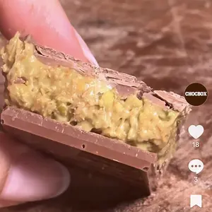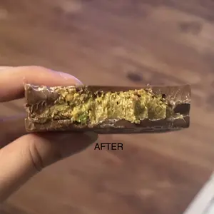 Ratio of chocolate to Dubai mix is way too much chocolate. Can’t taste Dubai pistachio at all. After seeing their video, versus what I recieved, it’s very different. First pic is what I received, 2nd pic is a screen shot from their video. 2 very different candy bars.