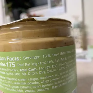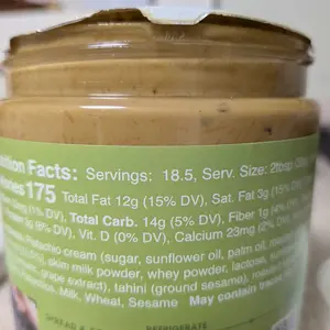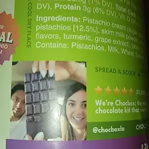 Ingredients: Pistachio cream (sugar, pistachios, sunflower oil, palm oil, skim milk powder, whey powder, lactose, sunflower lecithin, natural flavors, turmeric, grape extract), tahini (ground sesame), roasted kataifi (wheat flour, water).