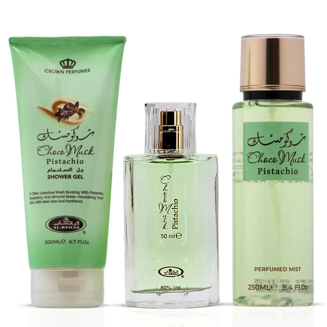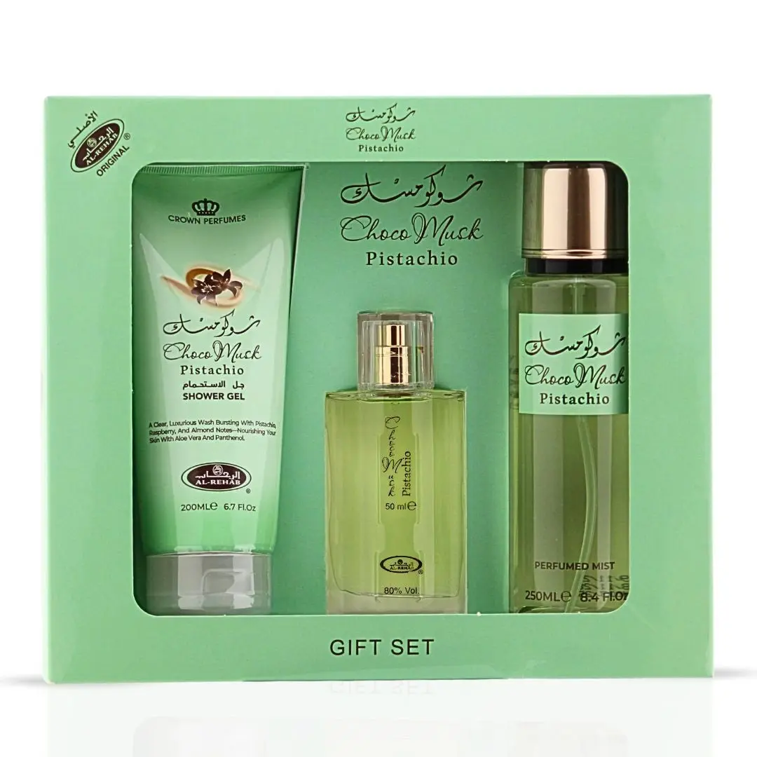 This gift set includes: 1. Choco Musk Pistachio Eau de Parfum 50ml by Al Rehab 2. Choco Musk Pistachio Shower Gel 200ml by Al Rehab 3. Choco Musk Pistachio Body Mist 250ml by Al Rehab
