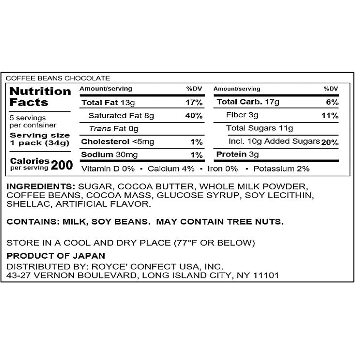 IngredientsSUGAR,COCOA BUTTER,WHOLE MILK POWDER,COFFEE BEANS,COCOA MASS,GLUCOSE SYRUP,SOY LECITHIN,SHELLAC,ARTIFICIAL FLAVOR,MILK,SOYBEANS,TREE NUTS