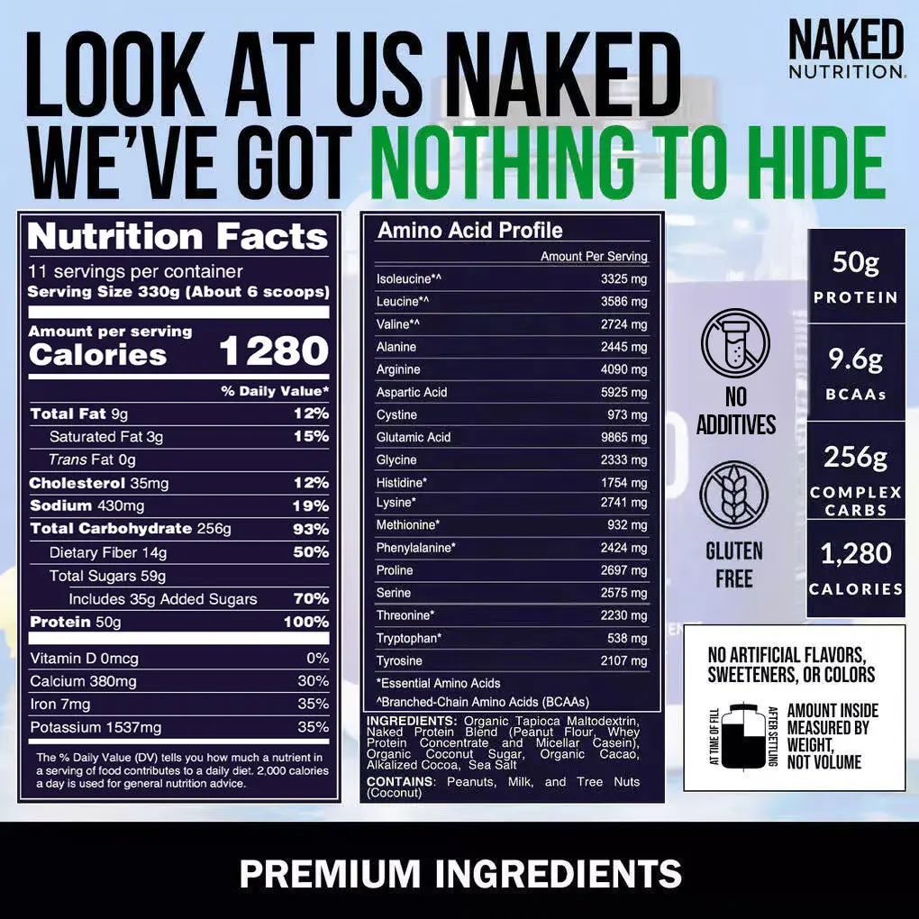 IngredientsOrganic Tapioca Maltodextrin,Naked Protein Blend (Peanut Flour,Whey Protein Concentrate and Micellar Casein),Organic Coconut Sugar,Organic Cacao,Alkalized Cocoa,Sea Salt