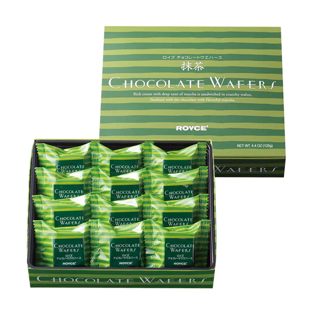 Indulge in our distinctive selection featuring Matcha cream nestled between crispy wafers, elegantly coated with white chocolate infused with the exquisite essence of Matcha. Each box contains 12 meticulously crafted pieces, inviting you to savor the perfect harmony of earthy Matcha notes, crisp textures, and the smooth sweetness of green tea chocolate. Elevate your chocolate experience with this thoughtfully curated combination, designed to captivate your taste buds and provide a memorable and flavorful treat.