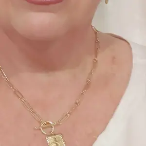 I love everything about this necklace. It's simple yet chunky. It can be worn alone or stacked. The lobster claw clasp is nice but the toggle is my favorite part. Gold over brass, nice quality and very affordable! Attention grabbing piece.
