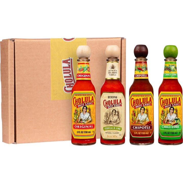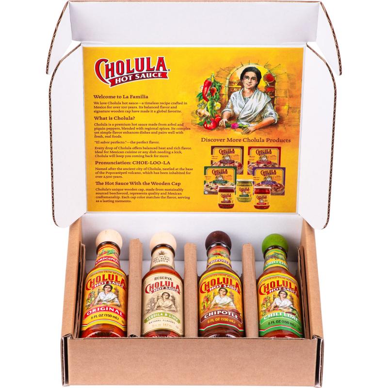 Make your thing the best thing with Cholula. Can’t decide which flavor is your fav? The Cholula Hot Sauce Variety Pack includes four different (5 oz) hot sauce flavors - Original, Reserva, Chipotle, and Chili Lime - a great way to sample them all! Cholula Hot Sauces are made with premium Mexican chili peppers like árbol, piquín, chipotle, habanero, and jalapeño, and an array of regional Mexican spices to bring you complex flavors and balanced heat in every bite. Enjoy this variety pack of hot sauces with Mexican dishes like carnitas, enchiladas, and tamales as well as eggs, fish tacos, guacamole, and Margaritas. This specially curated set comes with Cholula recipe cards for inspiration in a box that’s just right for gifting to the Mexican food fans, hot sauce lovers, and flavor adventurers in your life.