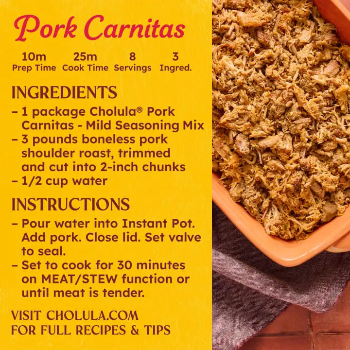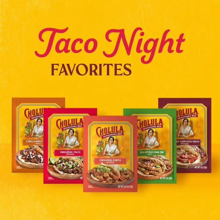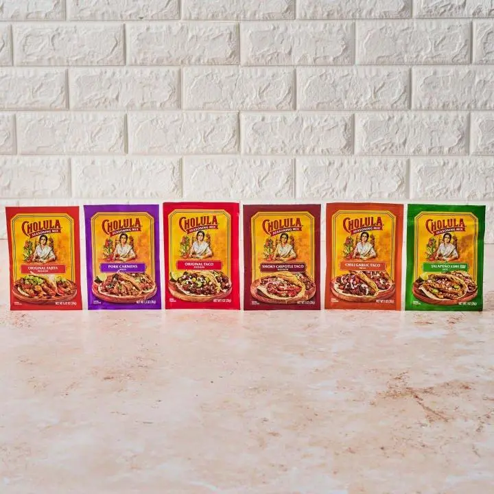 Invite flavor to your table with Cholula® 6-Count Seasoning Mix Variety Pack. With bold, balanced flavors, and signature spices, each single-use packet of seasoning mix makes it easy to create delicious tacos, fajitas and more. Invite flavor to your table with Cholula® 6-Count Seasoning Mix Variety Pack. With bold, balanced flavors, and signature spices, each single-use packet of seasoning mix makes it easy to create delicious tacos, fajitas and more. Includes: (1) Original Fajita Medium: .87 oz: Blend of chili peppers and signature spices for delicious chicken, steak, or veggie fajitas. (1) Pork Carnitas Mild, 1.3 oz: Citrus and signature Cholula peppers for delicious carnitas. (1) Original Taco Medium, 1 oz: Just like our Original Hot Sauce, with medium heat for taco dinners. (1) Smoky Chipotle Taco, 1 oz: Rich, smoky flavor with mild heat. (1) Chili Garlic Taco, 1 oz: Garlic, arbol and piquin peppers, and signature Cholula spices. (1) Jalapeño Lime, 1 oz: Spicy, tangy flavor crafted with jalapeños and lime juice.