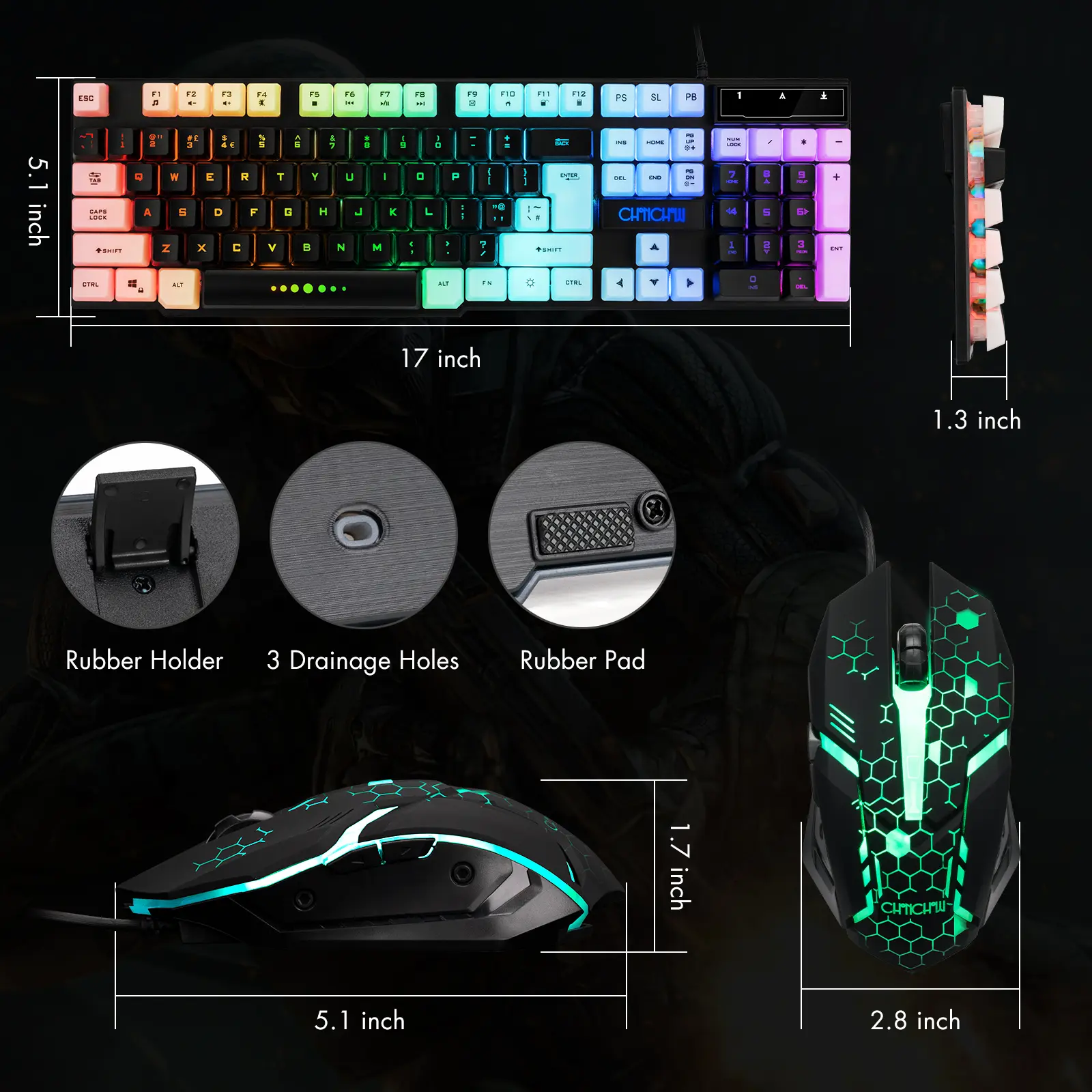 The CHONCHOW Gaming Keyboard and Mouse Combo offers a full-size USB wired setup with vibrant rainbow backlighting, ergonomic design, and strong compatibility. It is ideal for both serious gaming and everyday tasks.