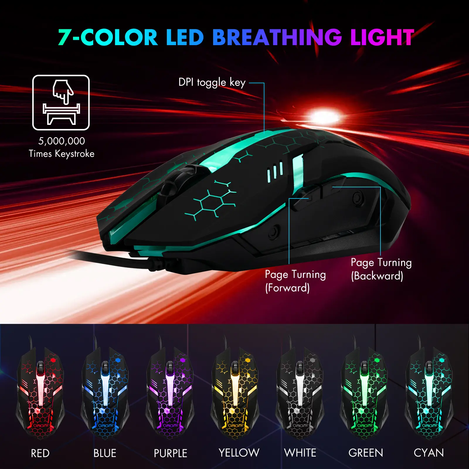 ·Full-Size USB Wired Setup: 104-key keyboard with a mechanical feel and 3600DPI mouse.