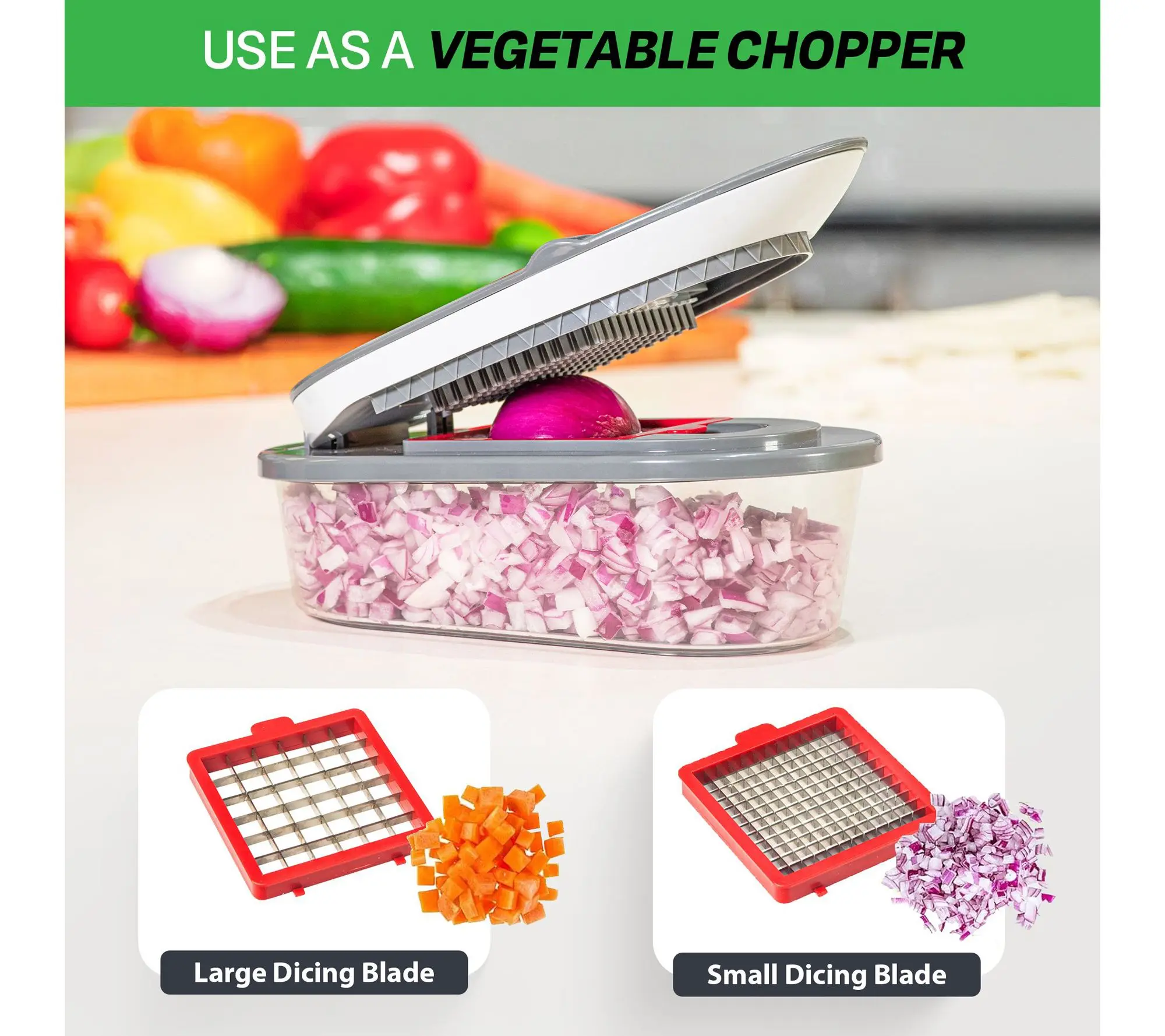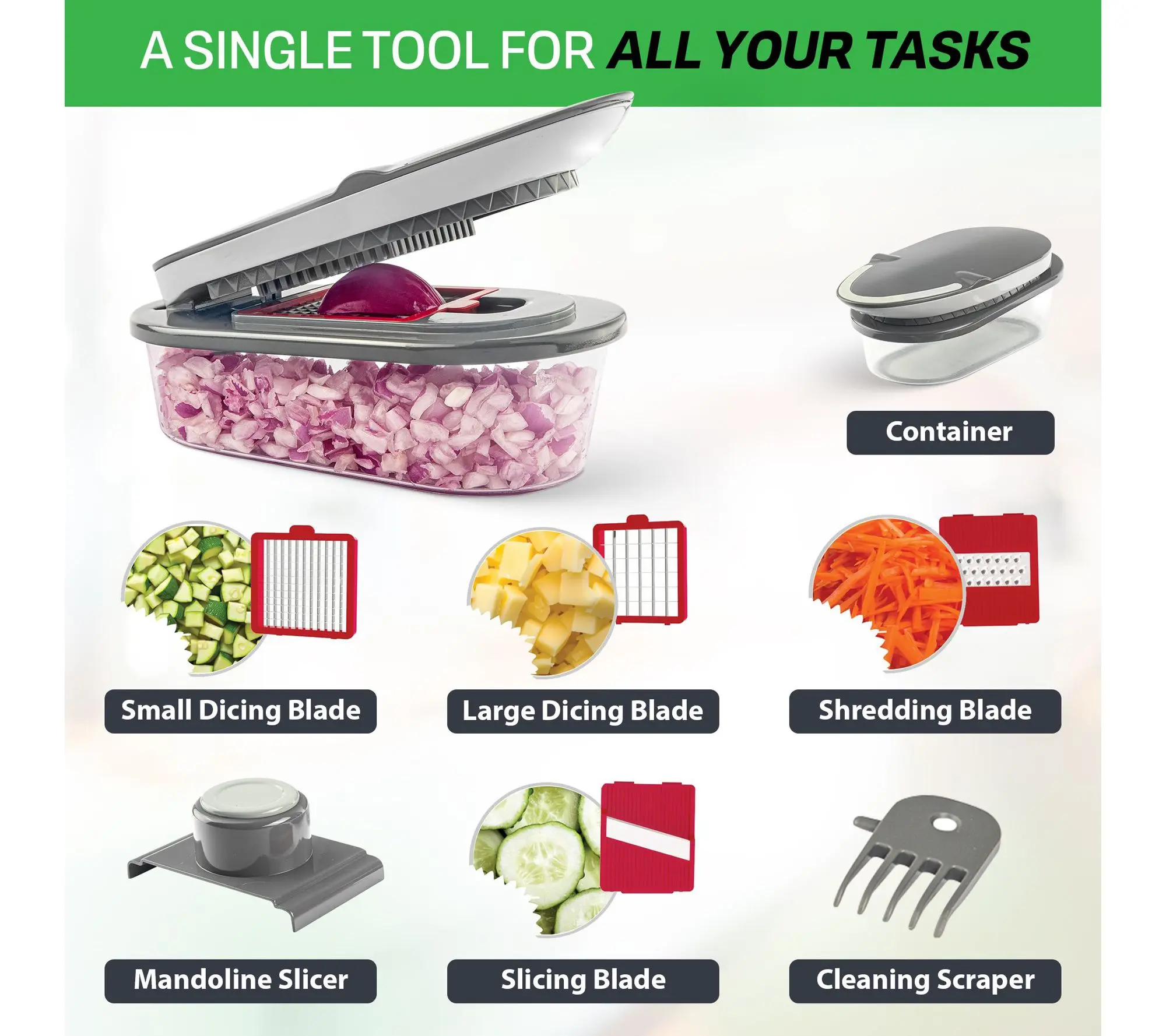 ·Includes container, small dicing blade, large dicing blade, shredding blade, mandoline slicer, slicing blade, and cleaning scraper (1.4L capacity)