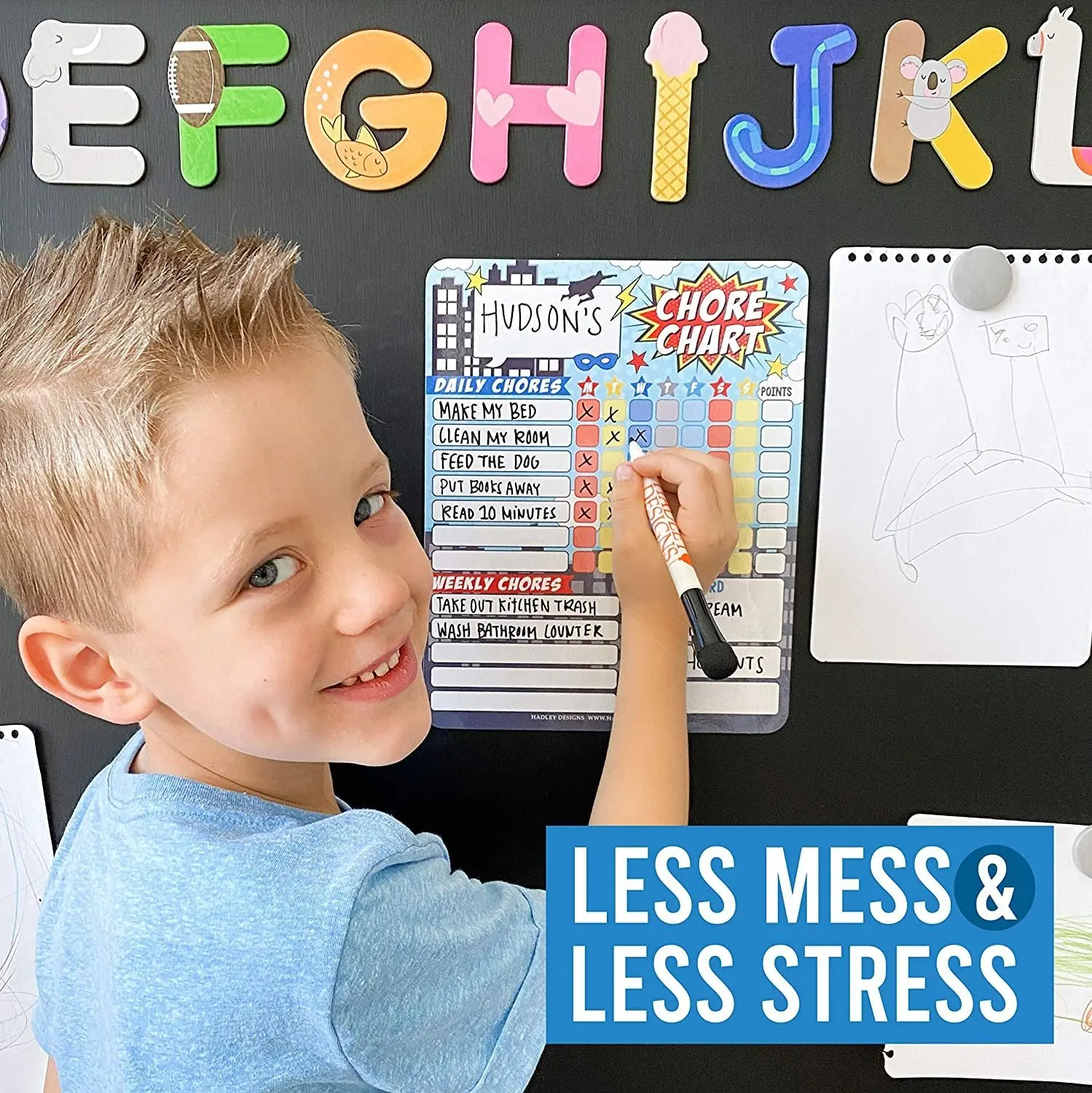 ·Less Mess, Less Stress; We are so confident in the quality of our chore charts that we offer a lifetime manufacturer guarantee; If you have any issues with your chore chart we will replace it with a smile; Our family owned business is here to inspire your family to have a happier and more organized life at home; Why wait, start teaching your kids responsibility and organizing family life today