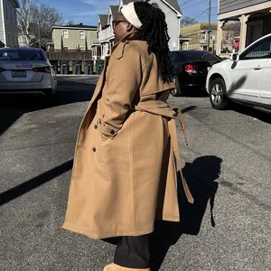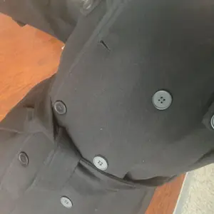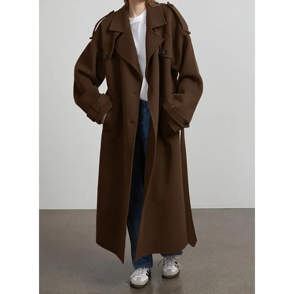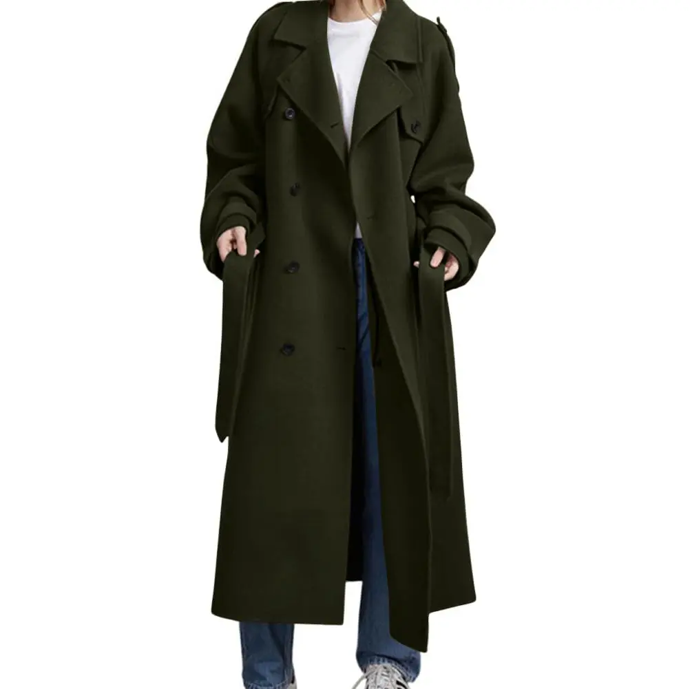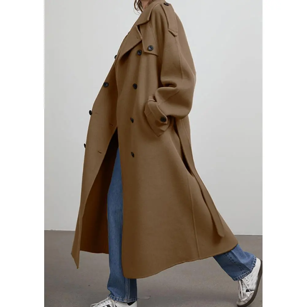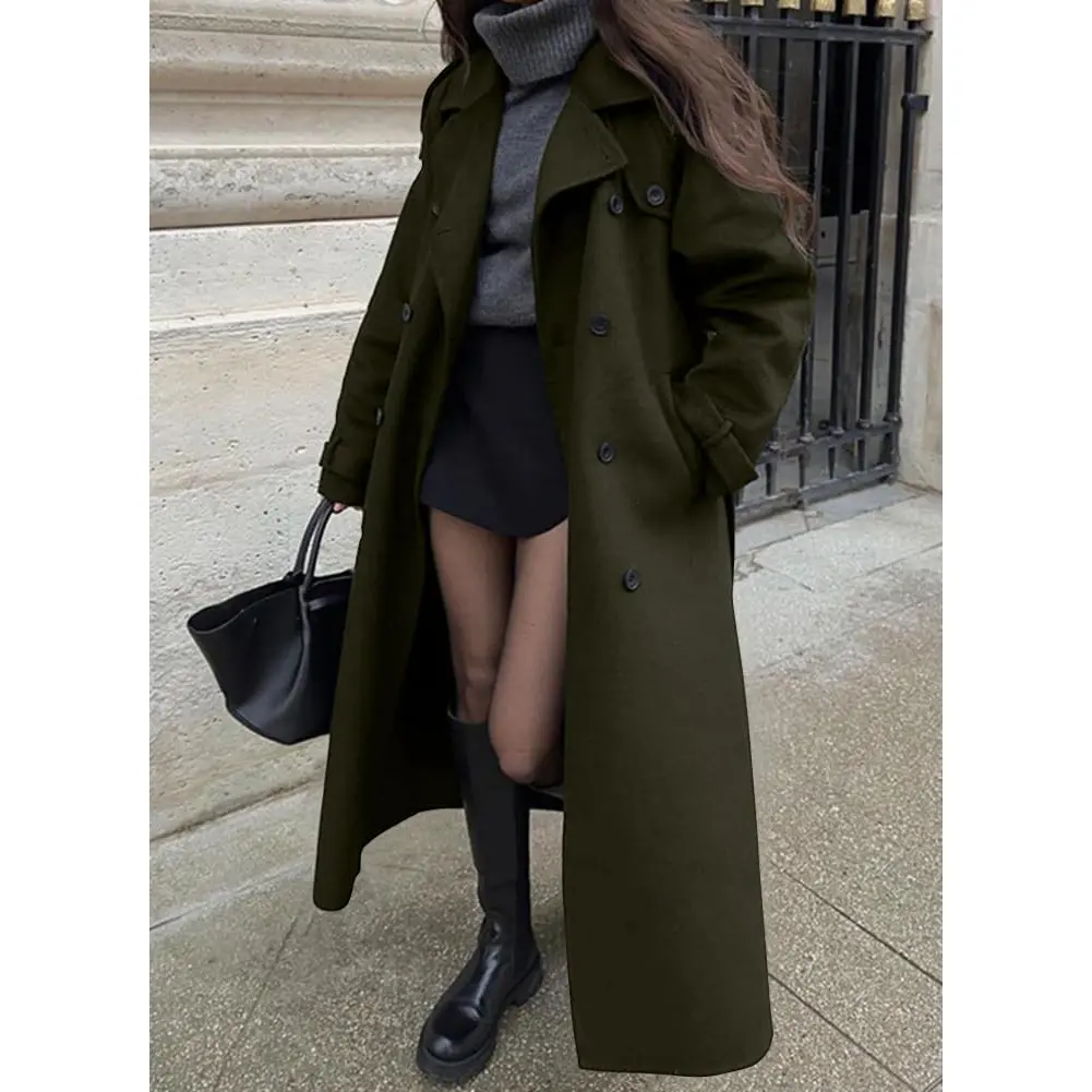 The attached image showcases the coat's design and fit, highlighting its mid-length length, notched lapel, and double-breasted front.