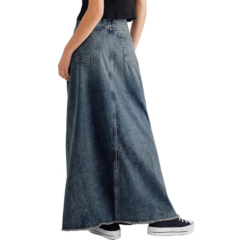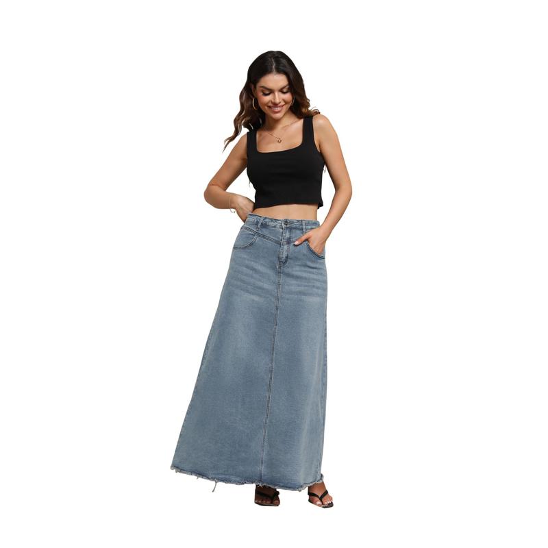 ·【Full Long Length】This lightweight denim long skirt is featured with stretch fabric, high waist and a-line silhouette, trendy raw hem cut for new y2k style, flared open bottom for freely move. Especially, the maxi length, not just make you look taller, also perfect for various body type.