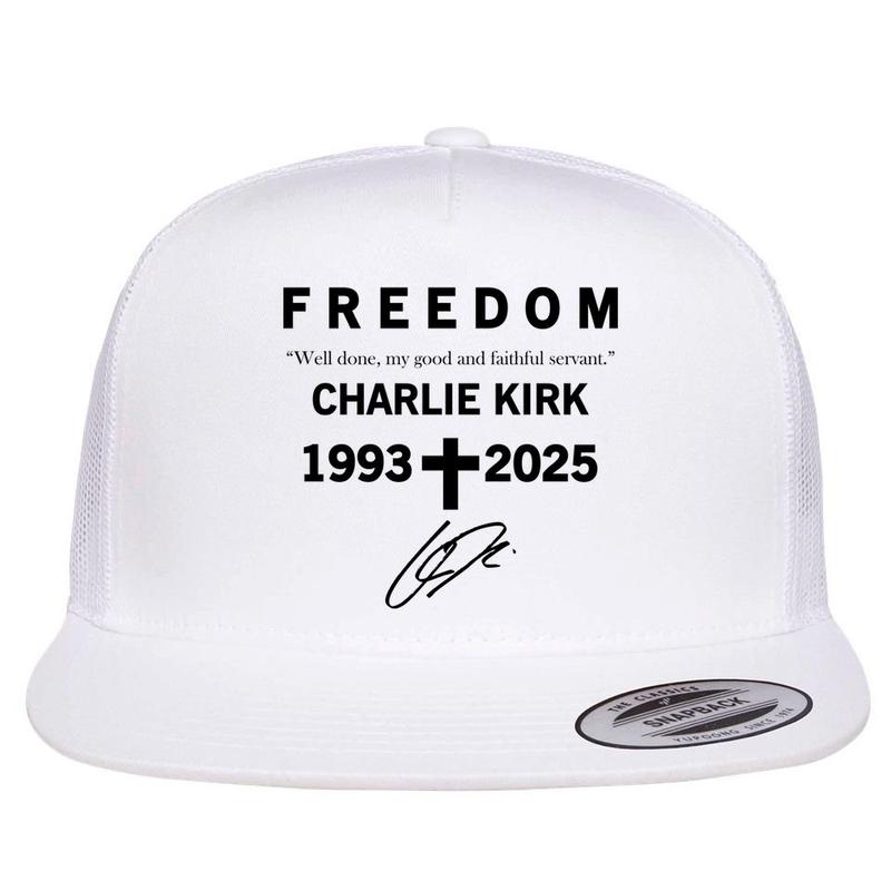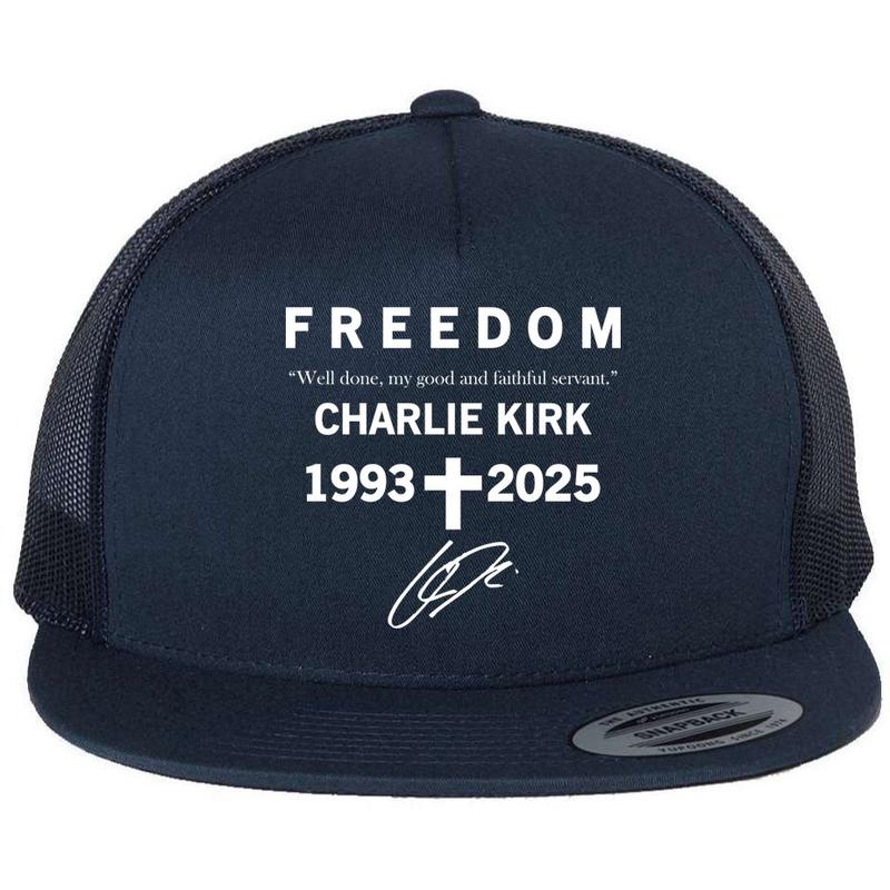 🎩 Freedom Charlie Kirk Well Done, My Good And Faithful Servant 1993-2025 Christian Faith Signature Flat Bill Trucker Hat