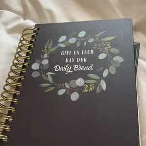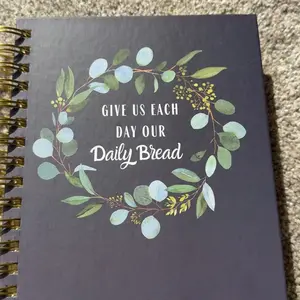✨ Elegant Design: A colorful floral wreath adorns the cover, paired with the inspiring "Give us each day our daily bread" from Matthew 6:11 on a navy-blue background. This journal is a beautiful way to start your day.