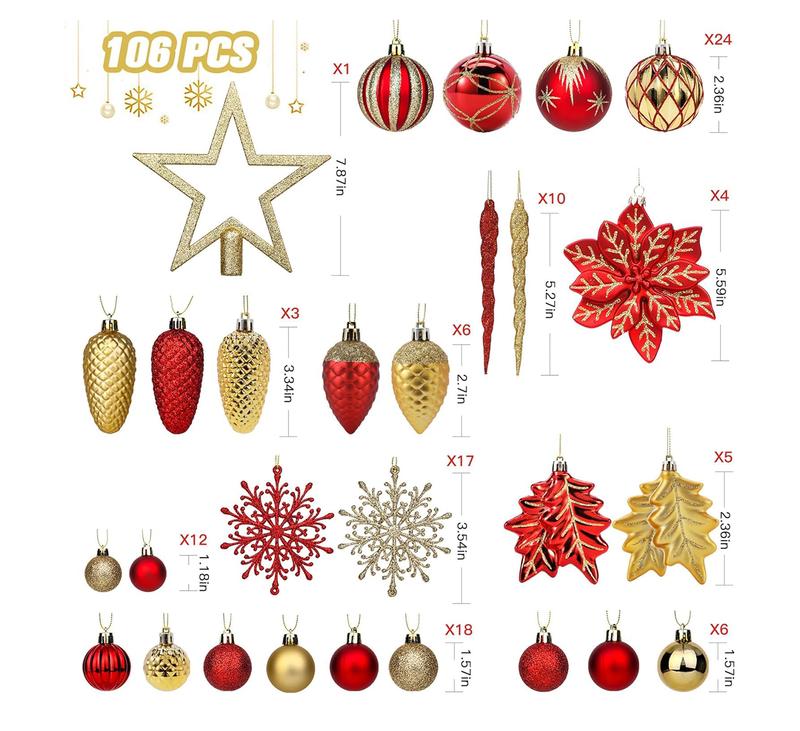 • Easy to Hang: This set includes 106 pieces of Christmas balls, each with a lanyard for convenient hanging. Unpack and decorate quickly, saving time and effort. Perfect for Christmas enthusiasts looking for hassle-free setup.