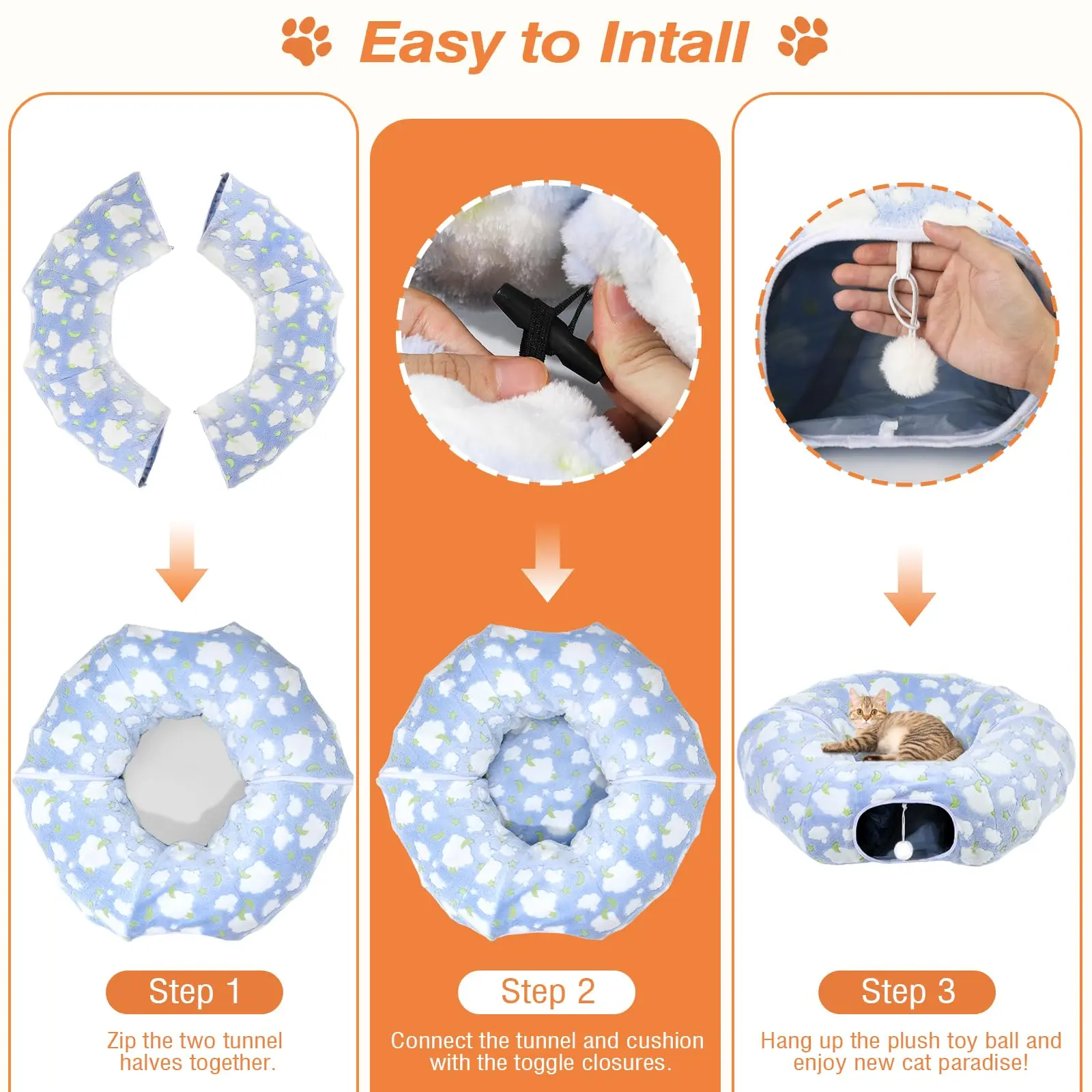 I was a little nervous as the package arrived very damaged, but the inside was undamaged. So easy to put together. The cats got in the right away and LOVE IT!!! It is very high quality and was packaged with spare pieces. We love this tunnel!!!!! Cat approved. We will order another one eventually.
