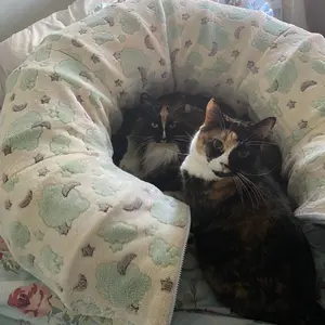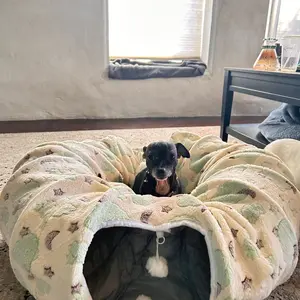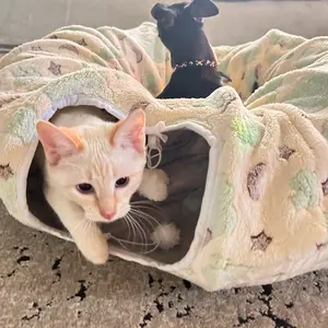 I was very pleased to see the quality of this product. It is very sturdy. It zips together easily and is bigger than I thought. I have full grown fat cats. And she fits! One of them does not like anything that makes noise and it crinkles a little when they run inside. But the other loves it!