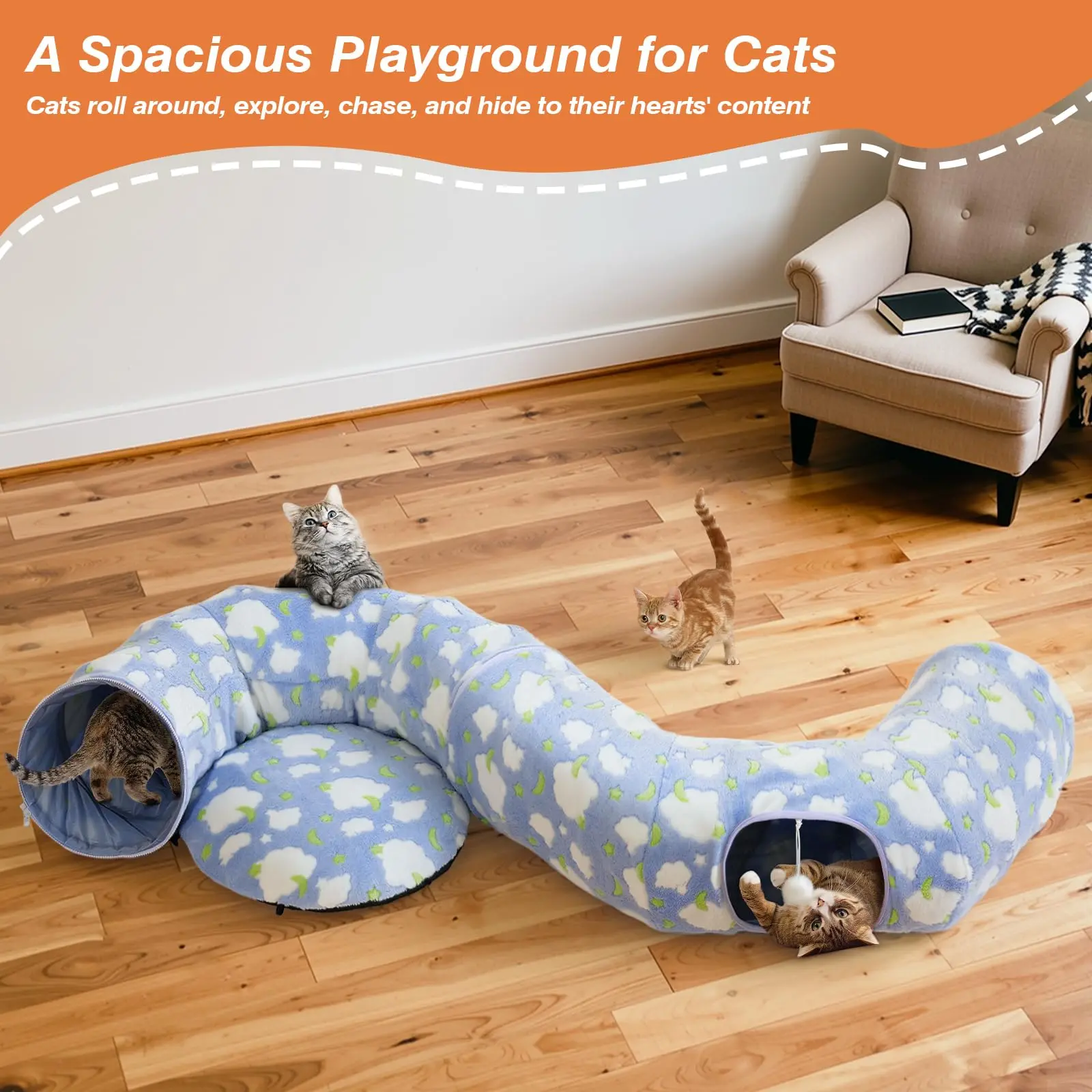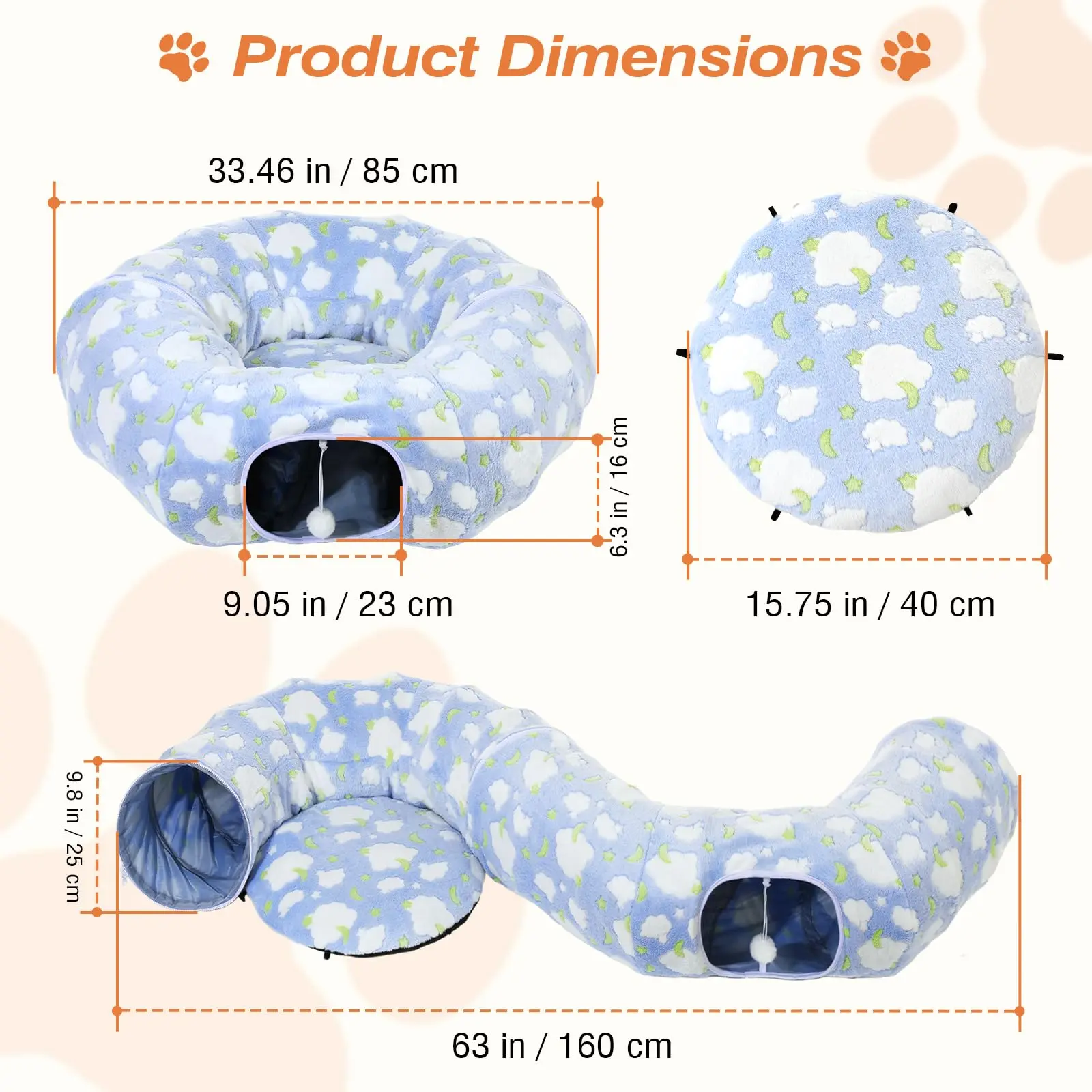 This is much larger than I expected. My cats really don’t play with it but they do like the bed in the center. Shown on a full size bed.