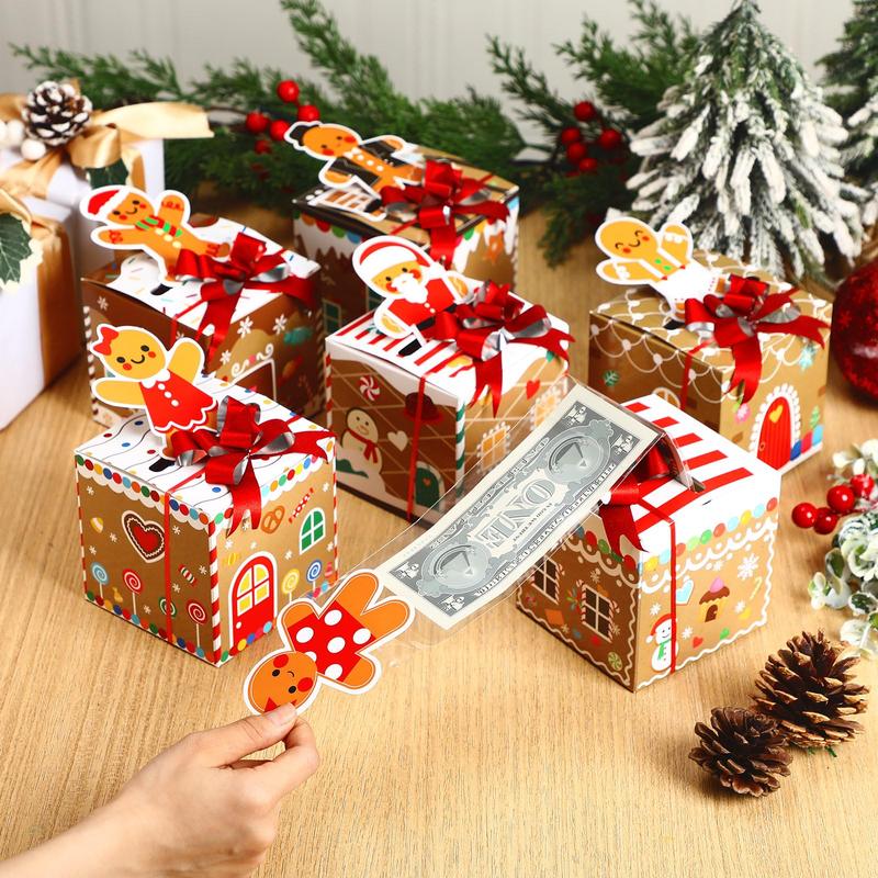 The cash bag features a straightforward sealing mechanism. The pull-out design of the money boxes adds a fun, surprise element. Recipients will enjoy the excitement of receiving a gift. The red bows enhance the Christmas charm.