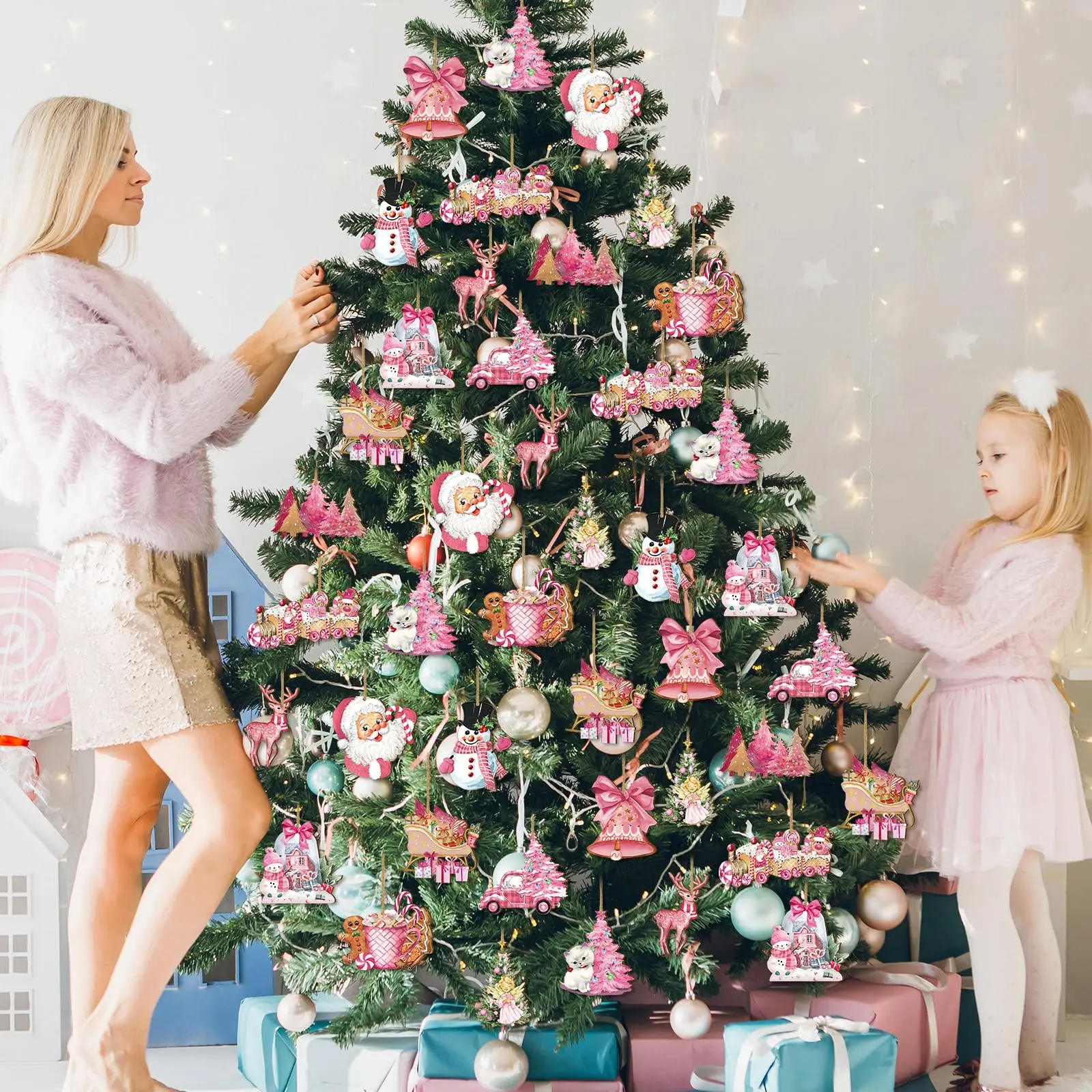 Christmas Clearance Sale 36 Pcs Christmas Ornaments Set Cute Pink Christmas Santa Claus Snowman Design Wooden Hanging Ornaments Christmas Decorations for Xmas Tree Holiday Party Home Decor Winter Crafts Supplies Christmas Gift Pink Girly Aesthetic