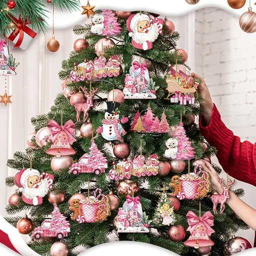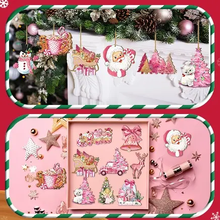 This charming set includes cute pink Christmas Santa Claus, Snowman, Reindeer, and Sleigh Bells designs. Perfect for decorating your Xmas tree, holiday party, or home. These wooden hanging ornaments add a festive touch to your winter crafts supplies. Ideal as a Christmas gift or Thanksgiving gift.