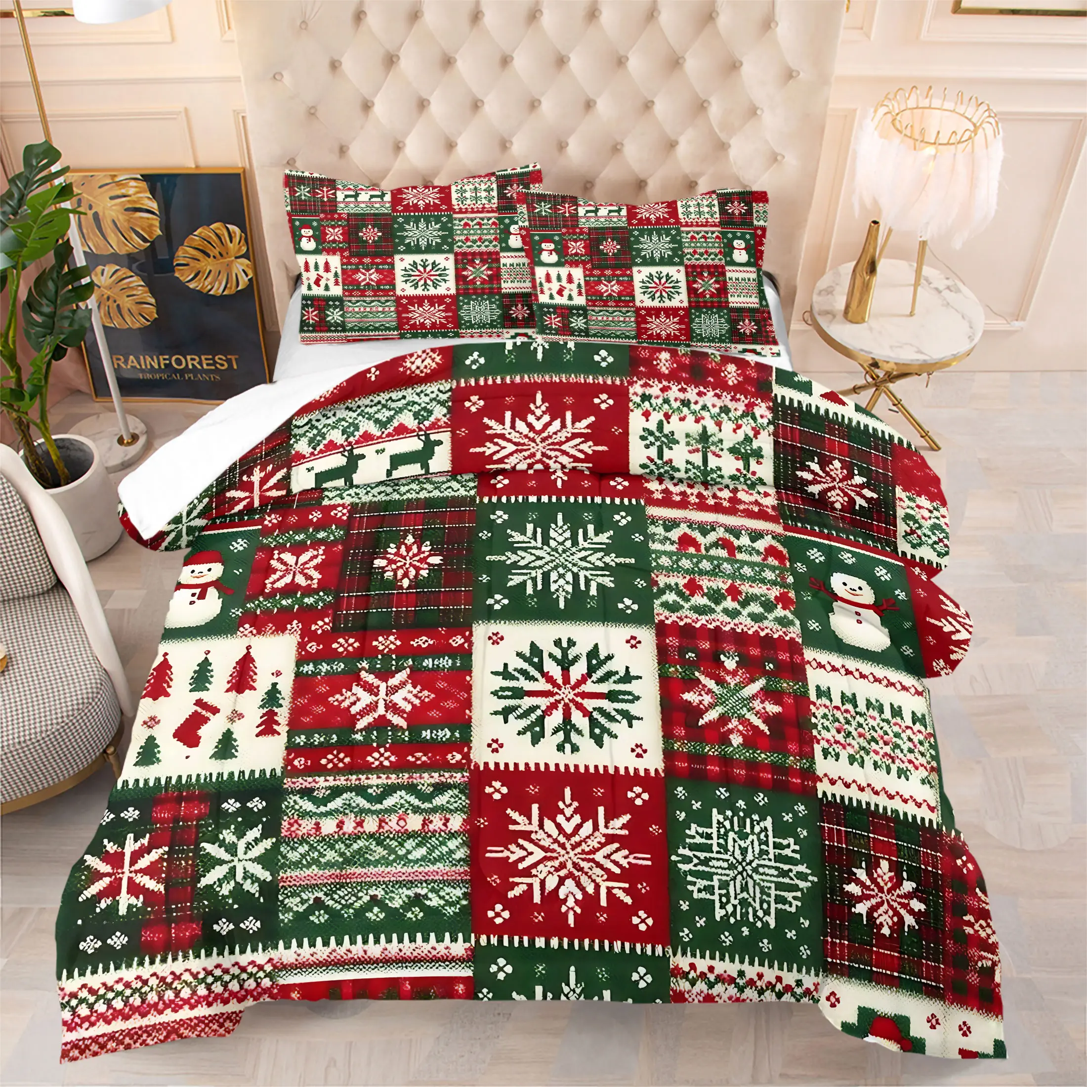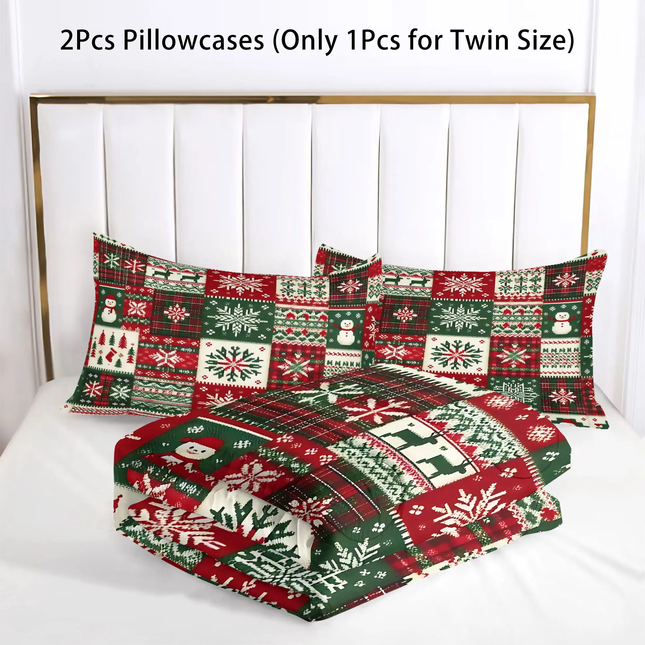 Christmas Patchwork Comforter Set, Festive Quilted Bedding Set with Snowmen, Reindeer, and Snowflakes, Cozy Holiday Decor for a Joyful Bedroom, Perfect for Winter and Holiday Celebrations, with 1 or 2 Pillowcase No Pillow Core, Bed Sheet Sets