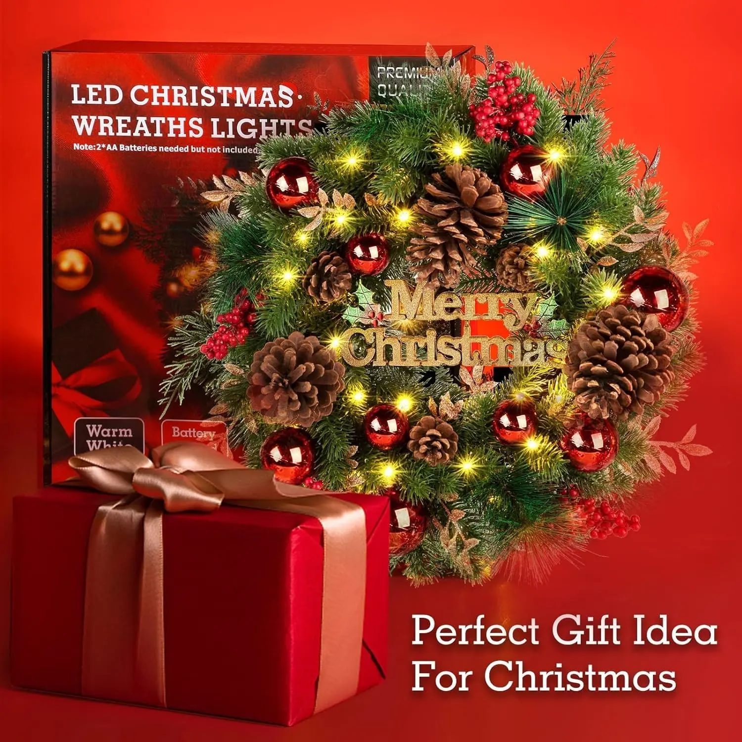 Christmas Wreath Light with Festive Elements: Our luxurious holiday wreath features a gold "Merry Christmas" sign, surrounded by realistic pine cones, red berries, red ball ornaments, and shimmering golden leaves. This vibrant design creates a lively atmosphere, perfect for celebrating the season and making your double front door radiate warmth throughout winter.
