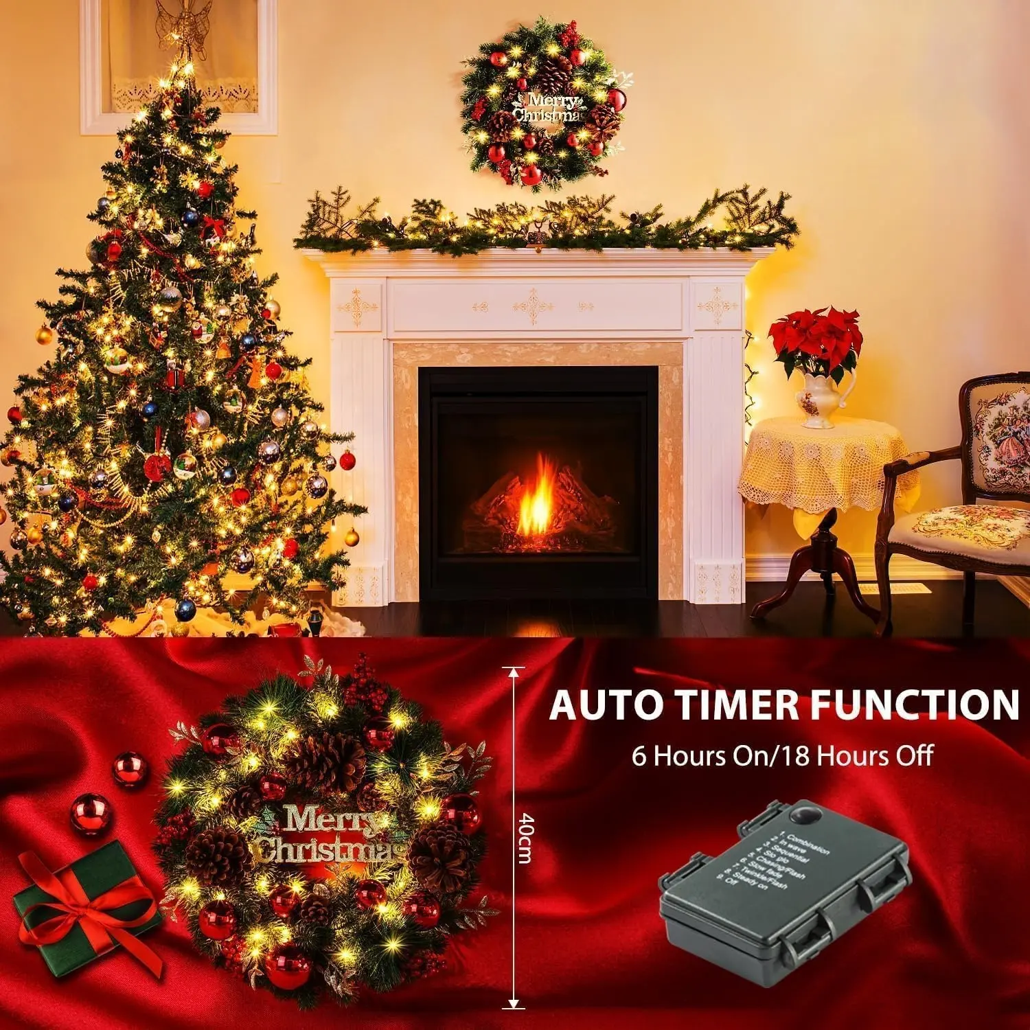 8 Modes with Timer: The Quntis Christmas wreath light requires 3 AA batteries (not included) and is adorned with 40 LED lights. Choose from 8 modes. The built-in timer activates automatically, keeping the lights on for 6 hours and off for 18 hours, conserving energy while ensuring your wreath shines brightly each evening.