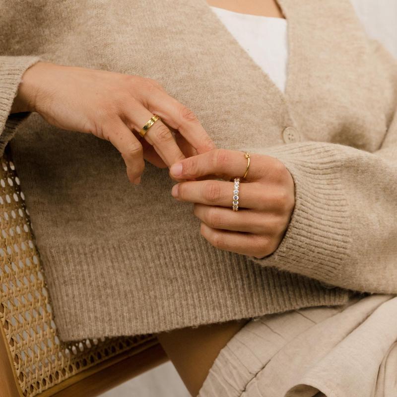 ·Model showcases a radiant, stacked look featuring our Ann Thin Message Ring and Knot Ring