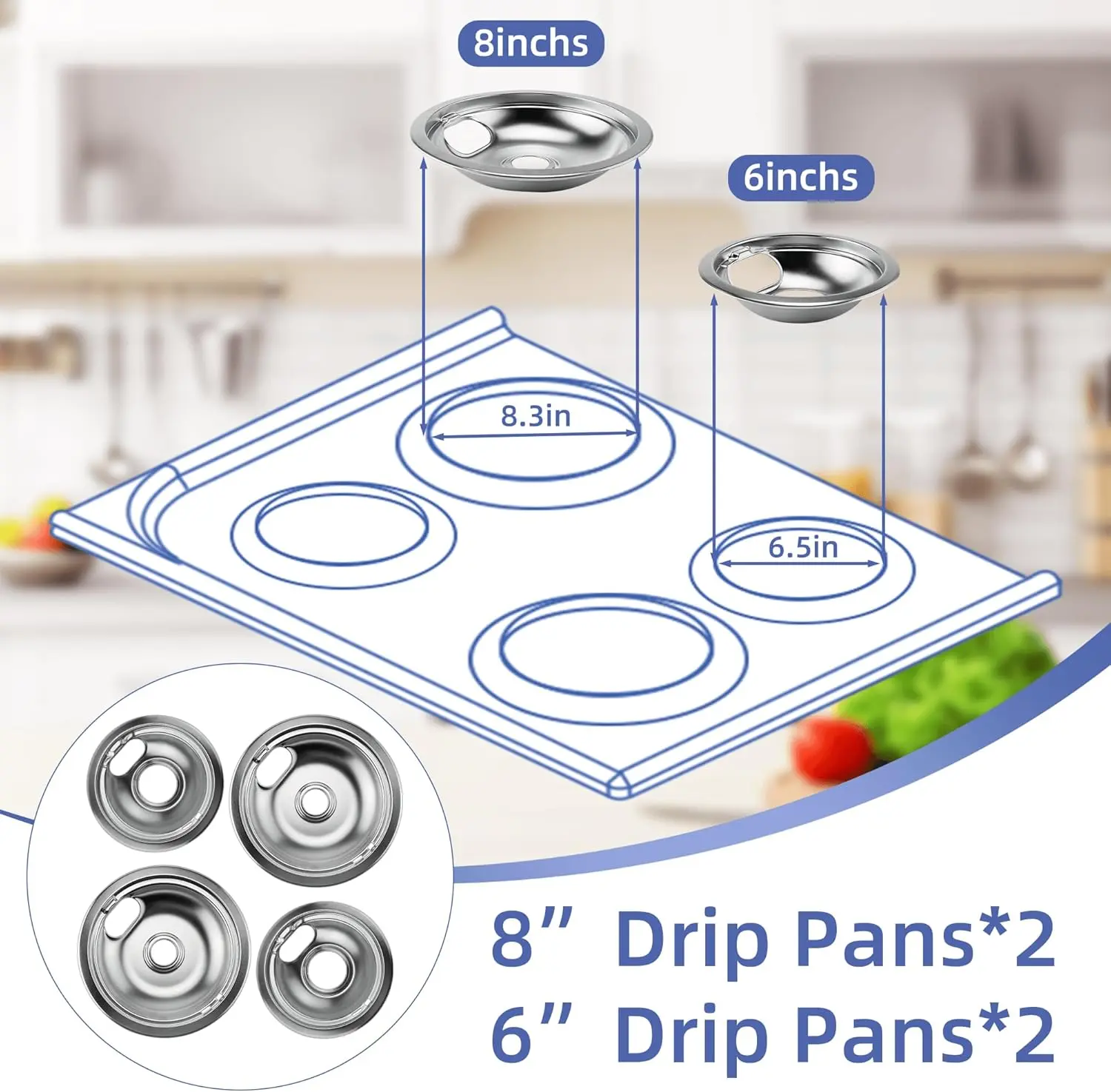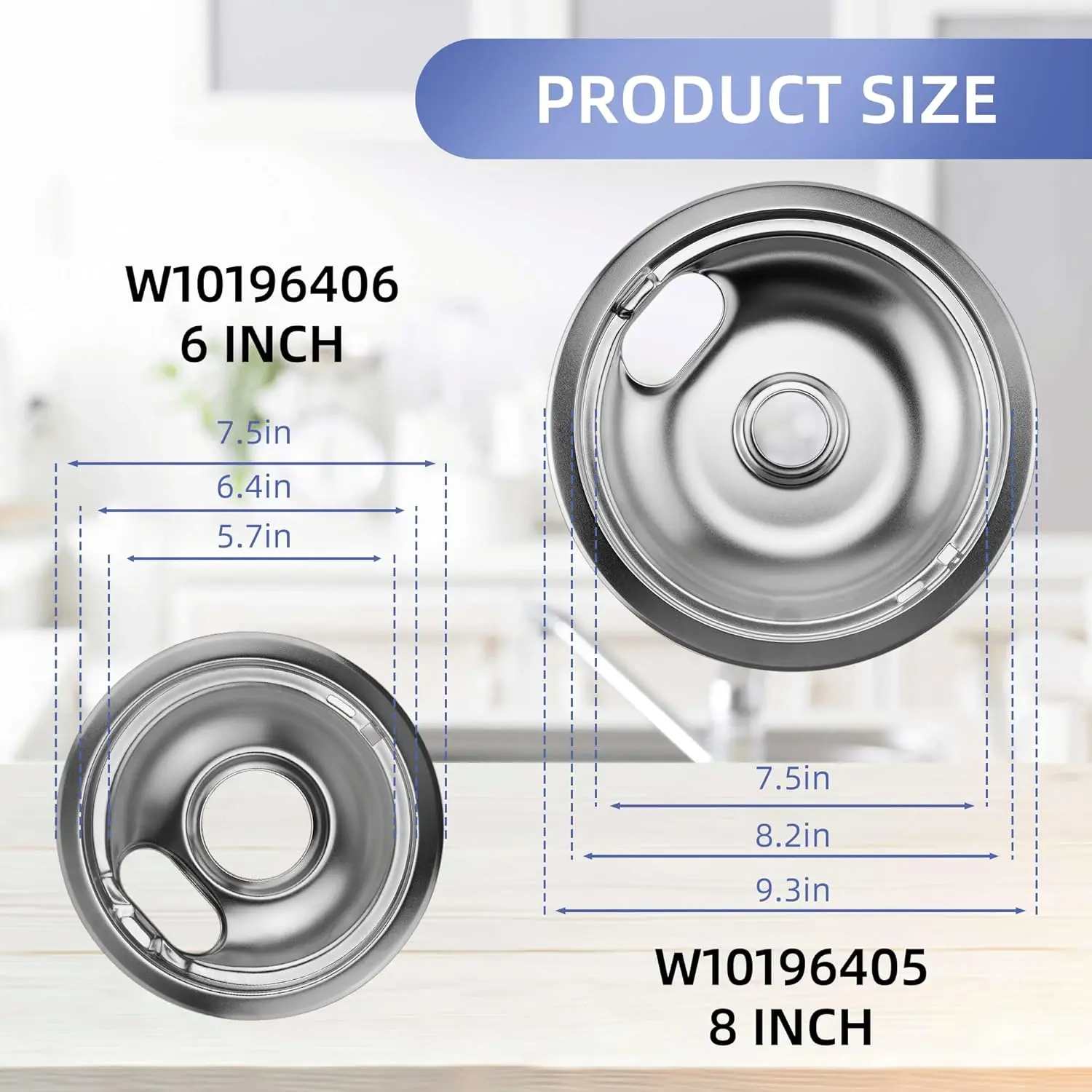 ·Includes 2 x W10196406 (6'' chrome plated burner drip pans), 7.45" diameter and 2 x W10196405 (8'' chrome plated oven drip pans), 9.35" diameter. The electric oven drip tray is made of durable chrome plated steel with environmentally friendly plating technology. Silver color.