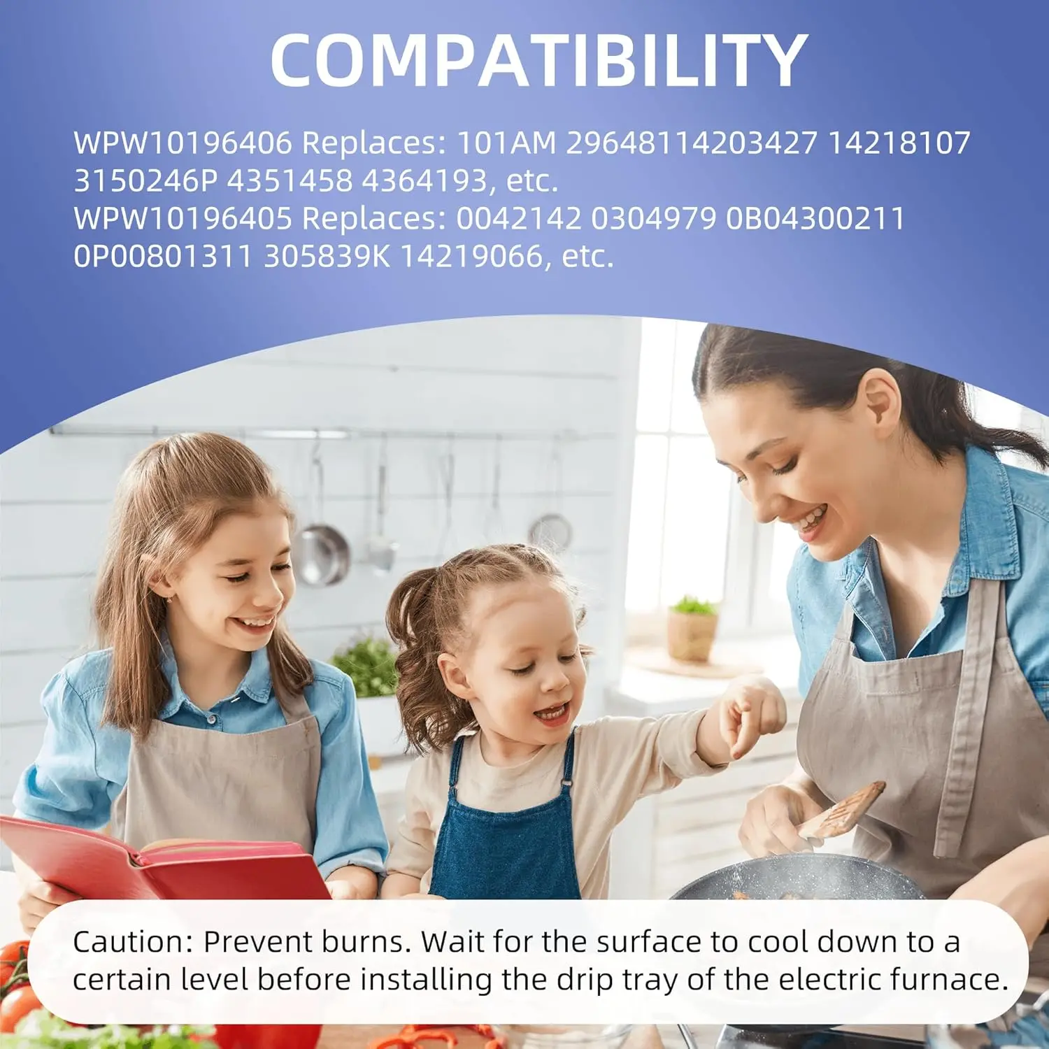 ·WPW10196406 Replaces: 101AM 29648114203427 14218107 3150246P 4351458 4364193, etc. WPW10196405 Replaces: 0042142 0304979 0B04300211 0P00801311 305839K 14219066, etc. Caution: Prevent burns. Wait for the surface to cool down to a certain level before installing the drip tray of the electric furnace.