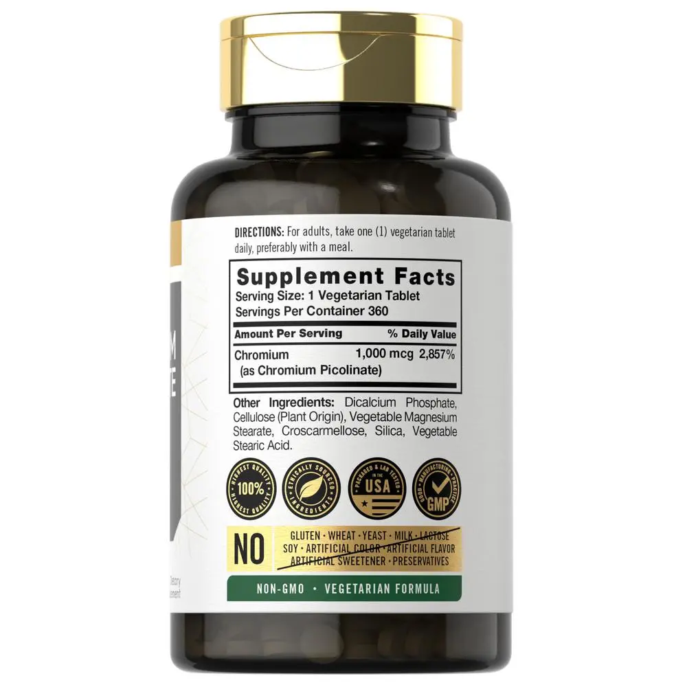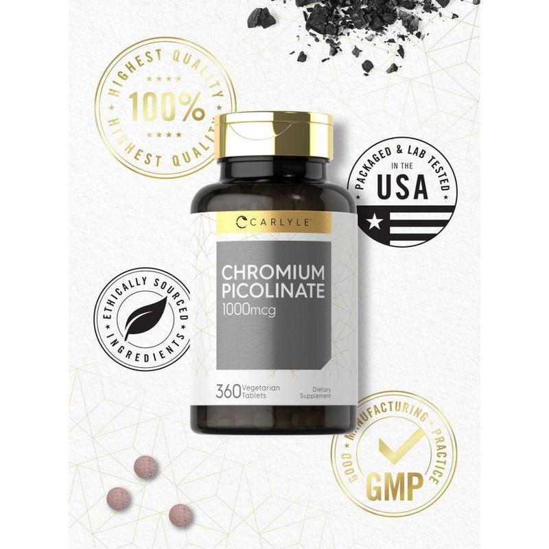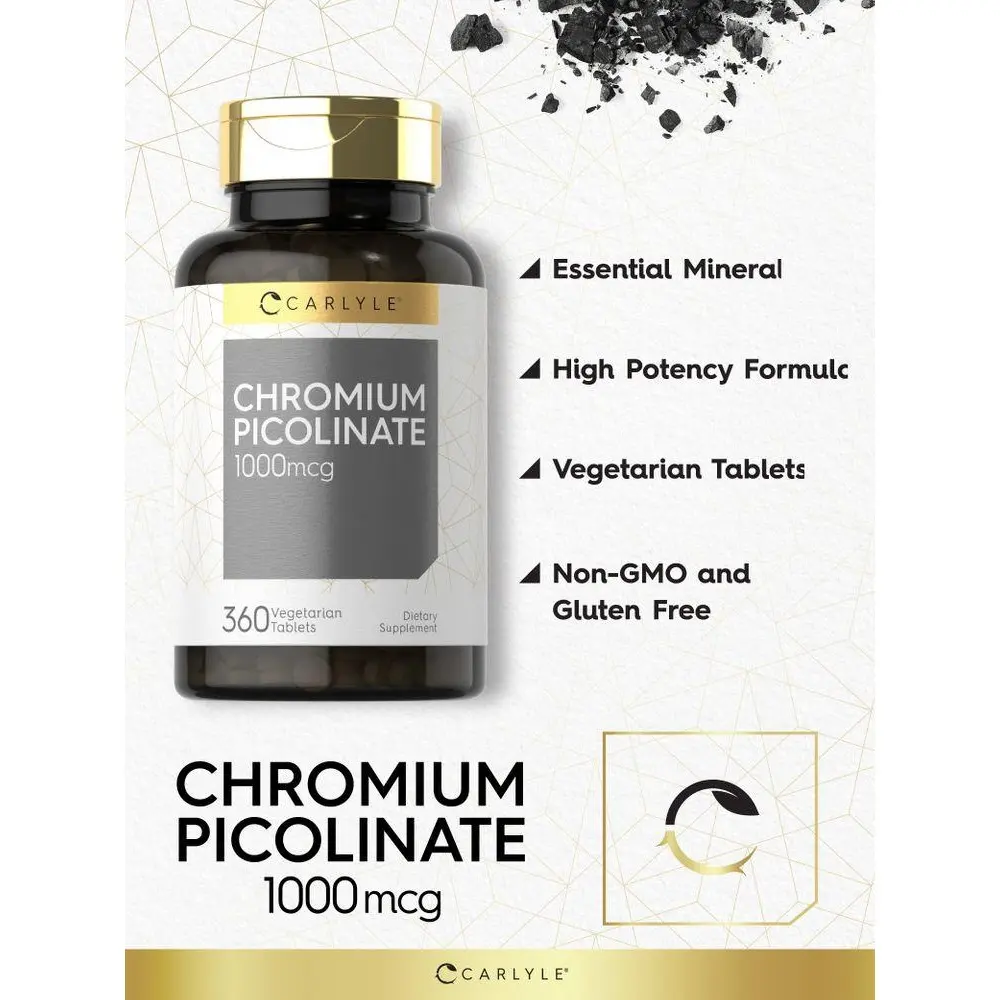 Looking for the best way to add it to your vitamin and mineral regimen? Carlyle Chromium Picolinate: Carlyle Chromium Picolinate is a high potency formula that pairs Chromium with Picolinic Acid, providing advanced absorption for this key mineral. Vegetarian tablets are gluten-free and non-GMO, containing 1,000 mcg of Chromium per serving to support a healthy lifestyle.