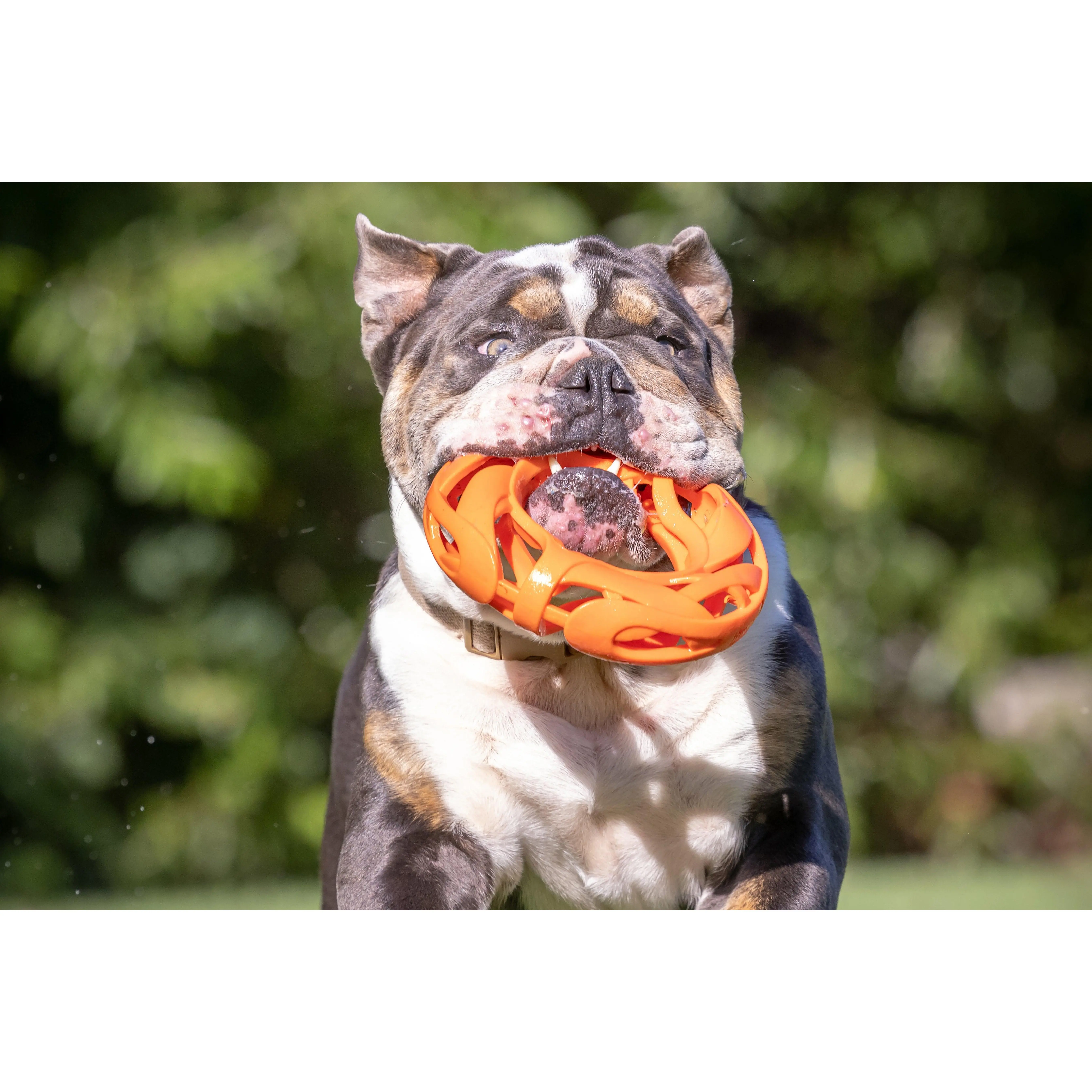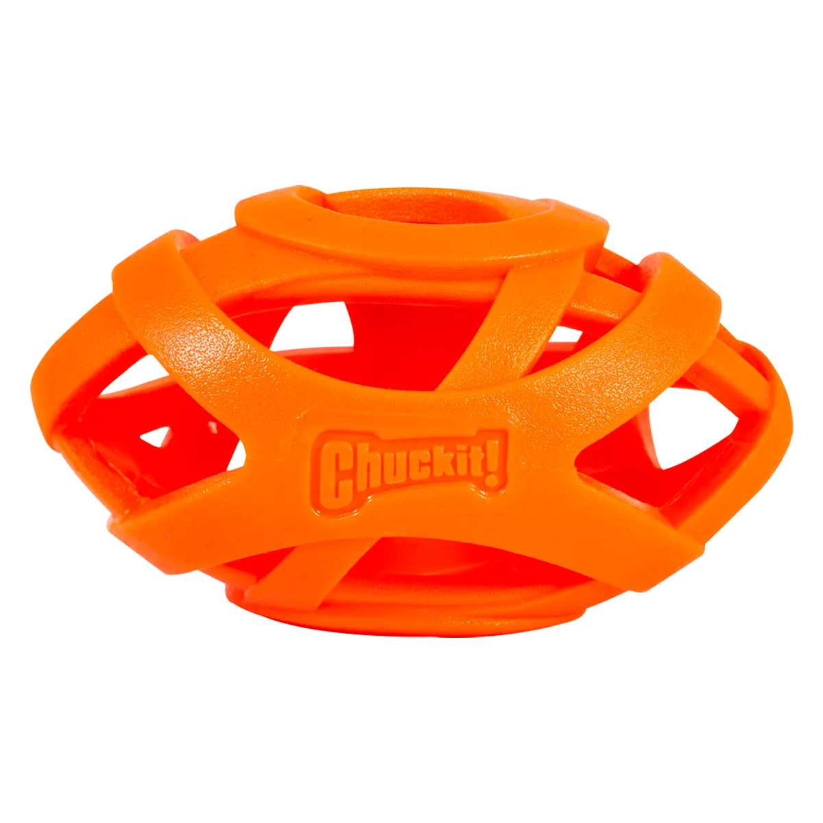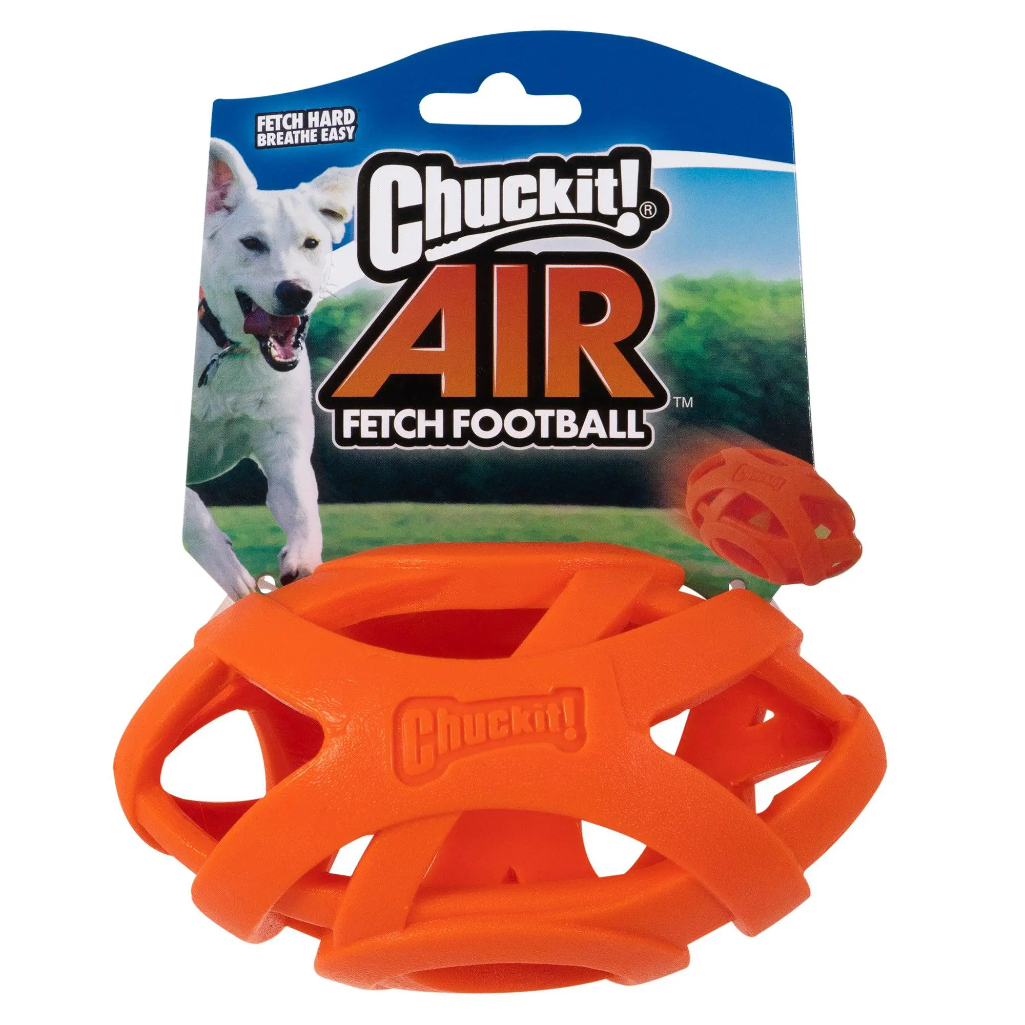 Fetch Hard, Breathe Easy™ with the Chuckit!® Air™ Fetch Football Dog Toy. Designed to make playtime last longer, Chuckit!'s line of Air™ Dog Toys features a hollow, web-like design that facilitates healthy airflow into your dog's lungs during playtime, improving your dog's stamina and reducing downtime after intense games of fetch. Available in one size, the Air Fetch Football is made from durable rubber that is gentle on your dog's mouth and features a bright orange color that makes it easy to find in grass, mud, snow, or water.