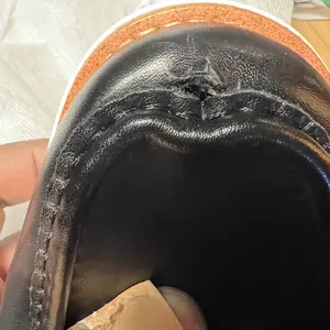 I just picked it up from my doorstep exited to open the box. A minute after that, the right foot front had a hole. That is not nice at all. The other thing, On the promotion, it says genuine leather when it is not. That is false advertising and not fair at all. expecting two more orders. Be good.
