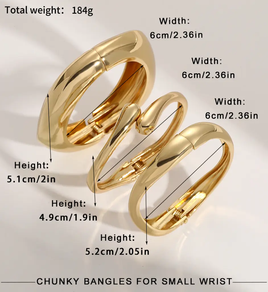 ·Chunky Bangles for Women: With a diameter of 6cm/2.36in and widths of 17mm/0.66in, 5mm/0.19in, and 5mm/0.19in, inner circumference: 17.5cm/6.88in, these chunky bracelets are designed to stand out. They are the ideal choice for those looking to enhance their outfit with eye-catching jewelry.