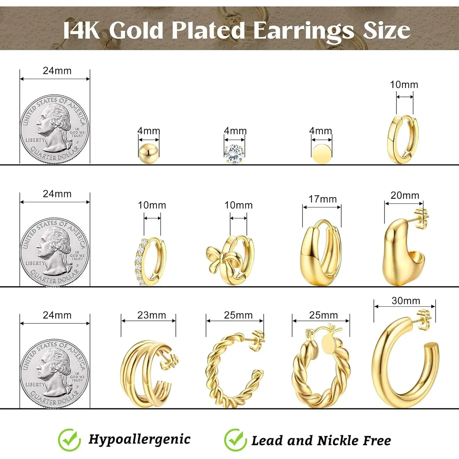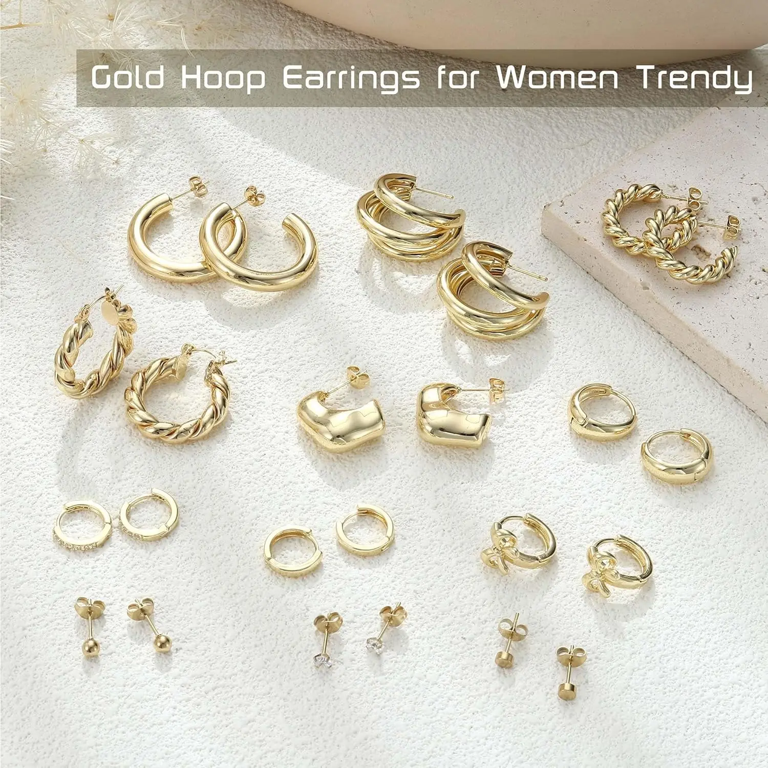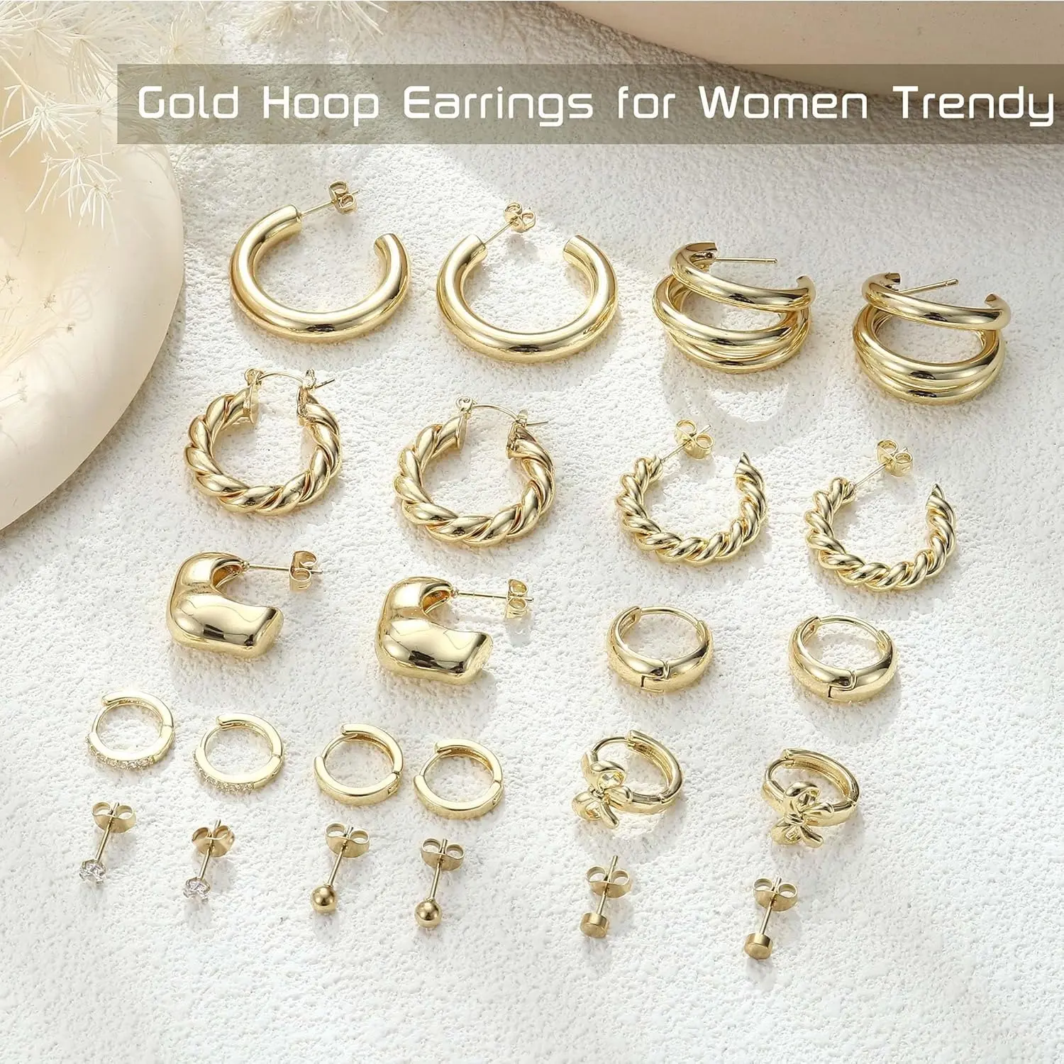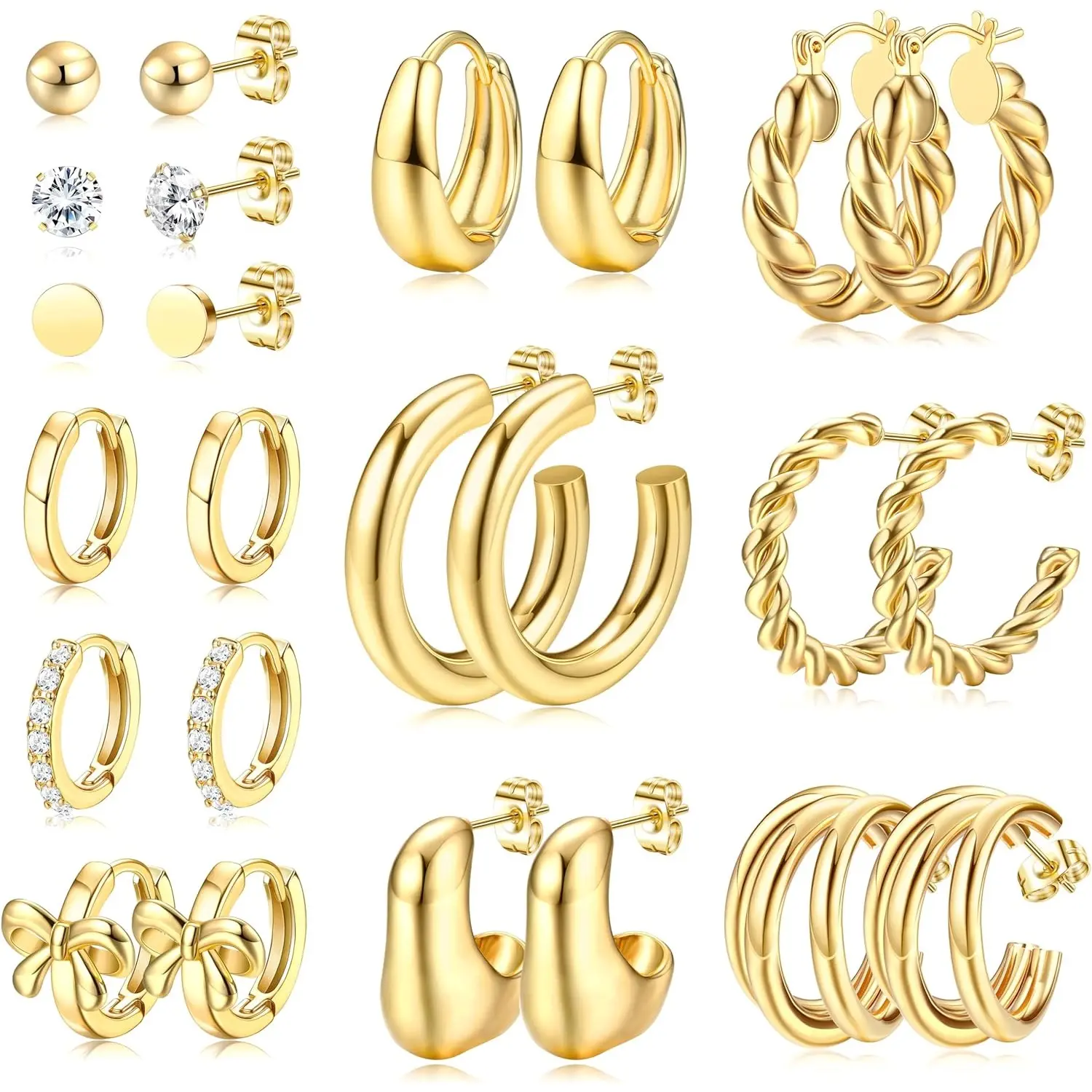 The set includes 12 pairs of gold hoop earrings, featuring 3 classic stud earrings, 3 small huggie hoops, and 6 chunky hoops. Perfect for adding elegance to any outfit. Choose from various styles to suit your look.