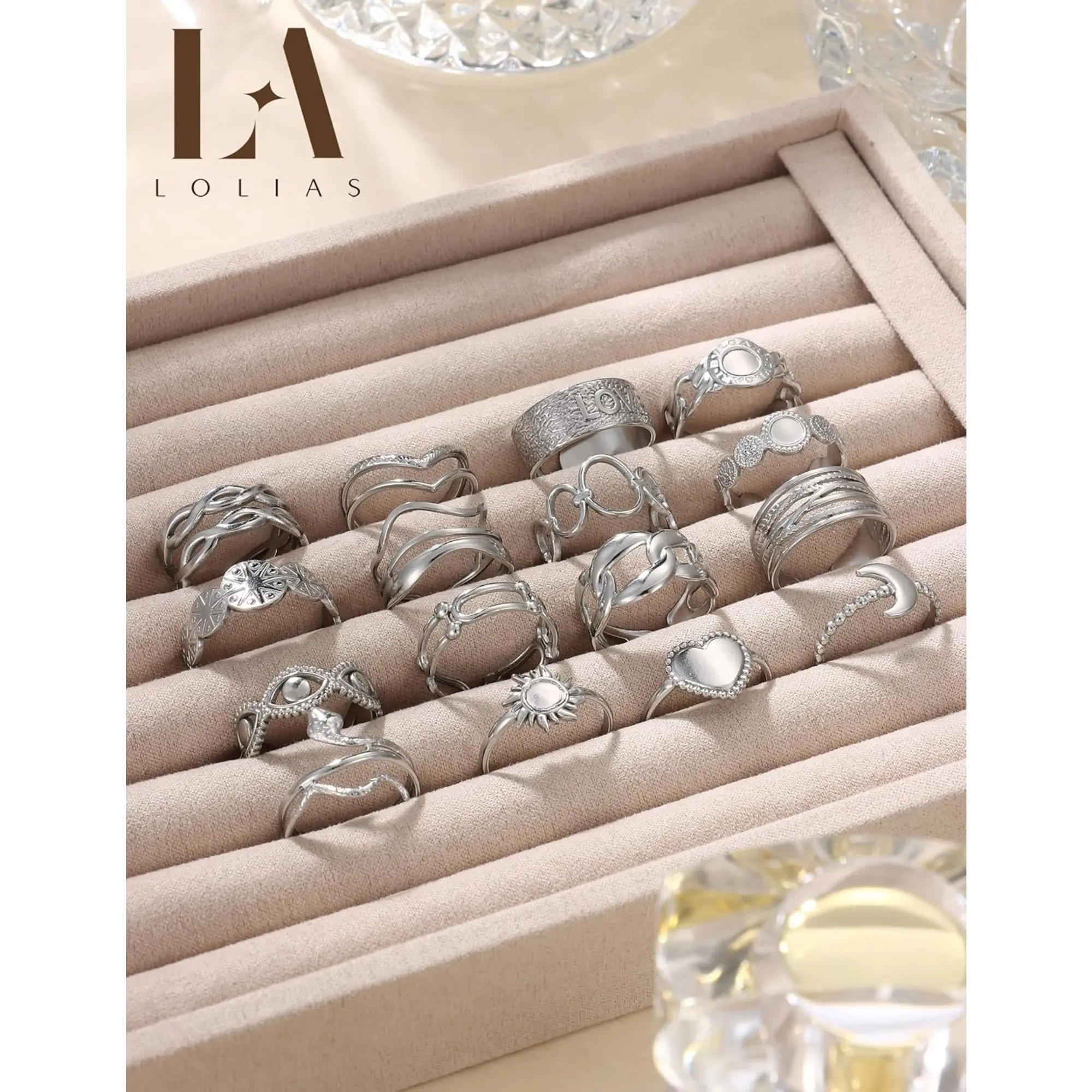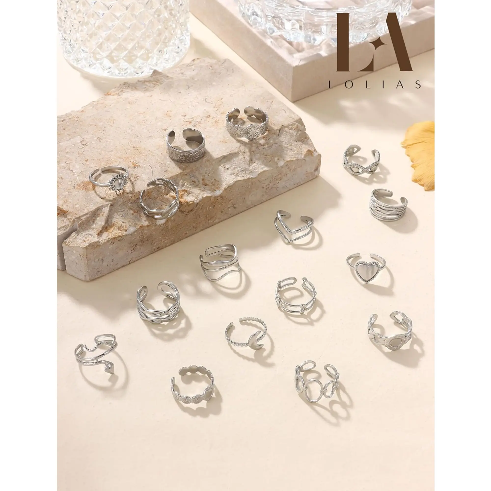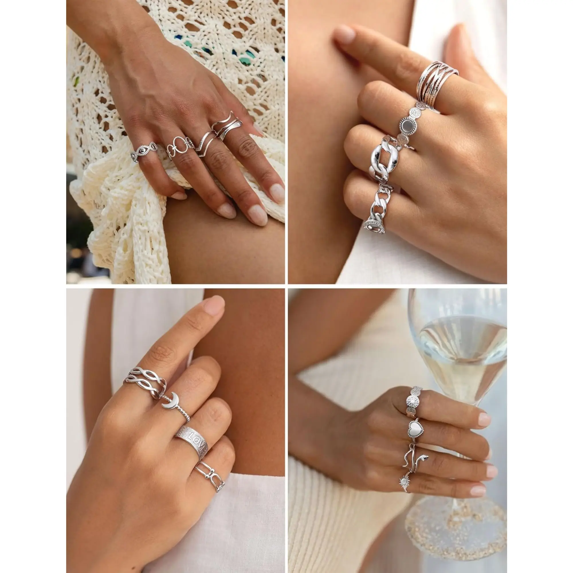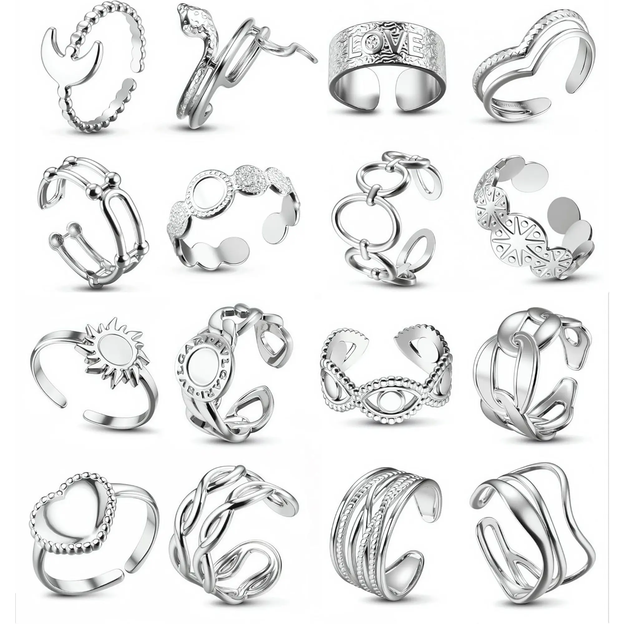 ·Silver Stainless Steel Ring Set (16-Piece)--Elevate your stack with 16 silver stainless steel rings featuring chunky rings, slim bands, and intricate designs from florals to geometric patterns. These non-tarnish silver rings for women combine the icy shimmer of silver rings with stainless steel's durability. Build your signature silver ring stack for daily wear or special occasions.