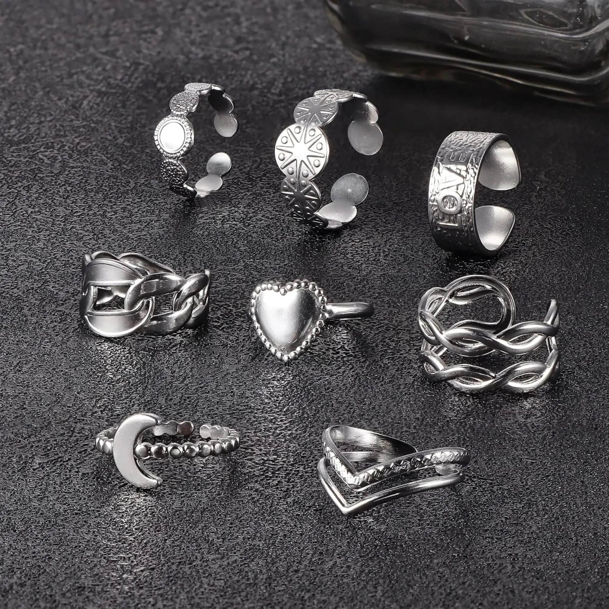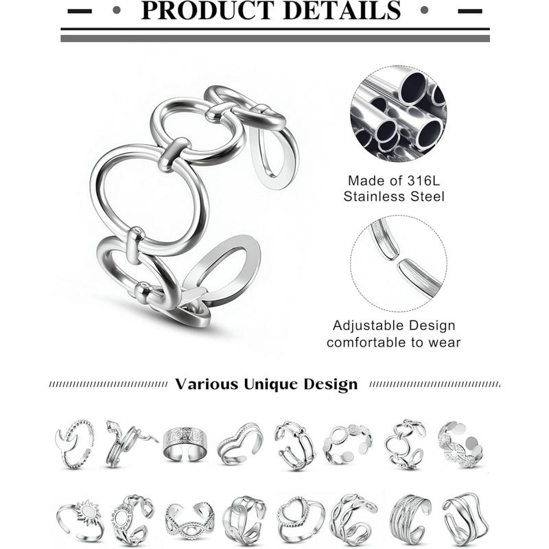 ·Adjustable Rings (US6-9)--One-size silver-tone stainless steel rings adapt to any finger through open-band engineering. Wear chunky rings silver styles as bold statement pieces or layer delicate silver stackable rings for women. Unisex design works as both womens silver rings and masculine silver accessories.