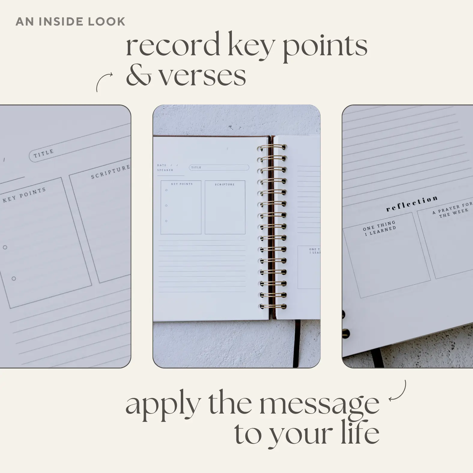 The Steadfast & Sustained church notes journal is structured to make taking notes easier. It features space to highlight key points and scripture references. There is open room for notes, and then reflection questions at the end to think and pray about the message. This allows the message to be applied to the following week, and remembered down the road!