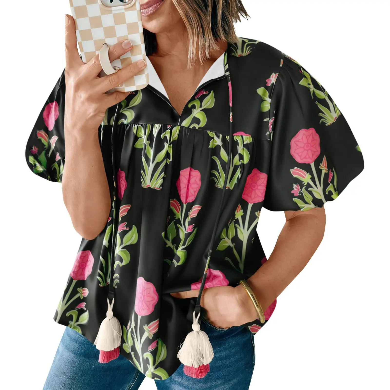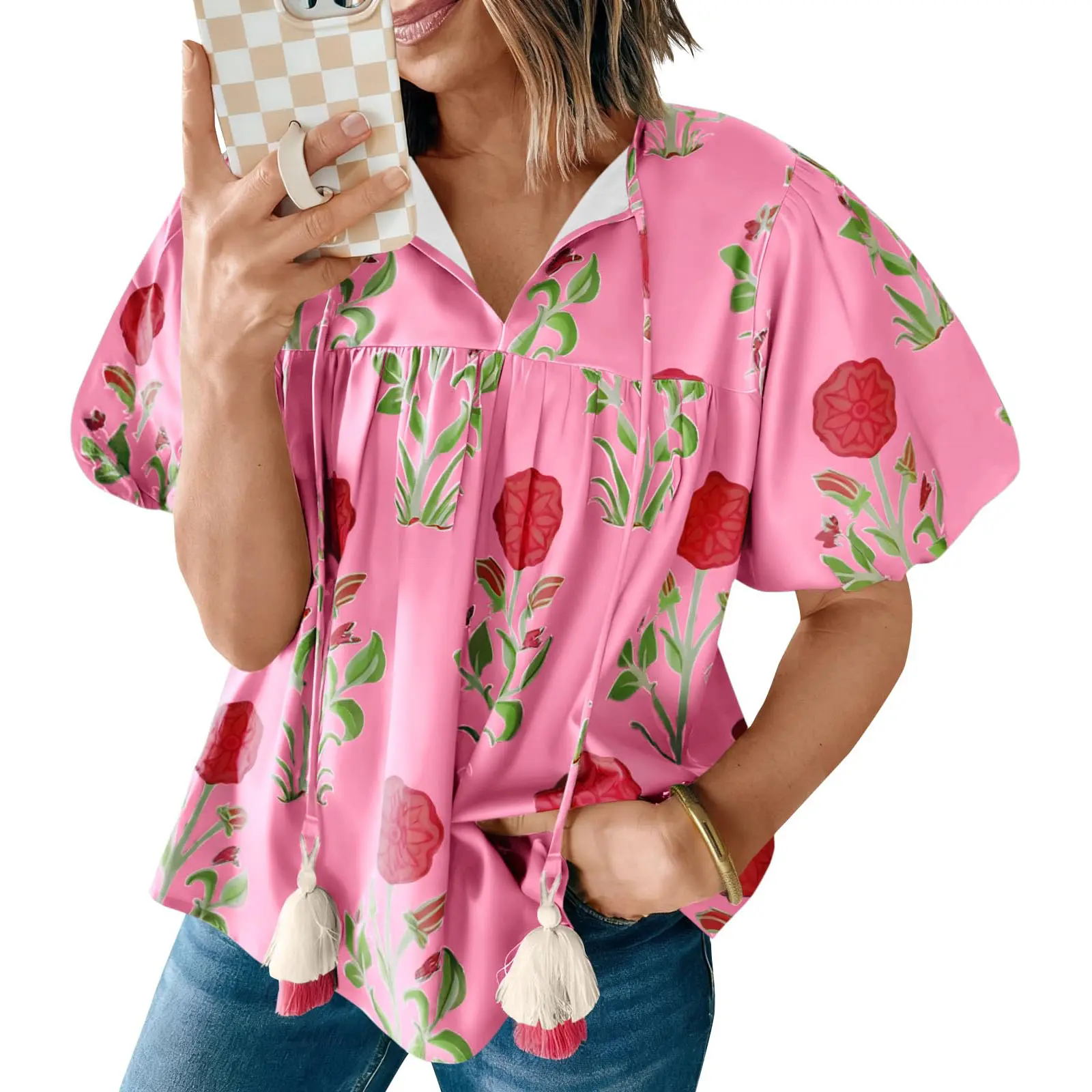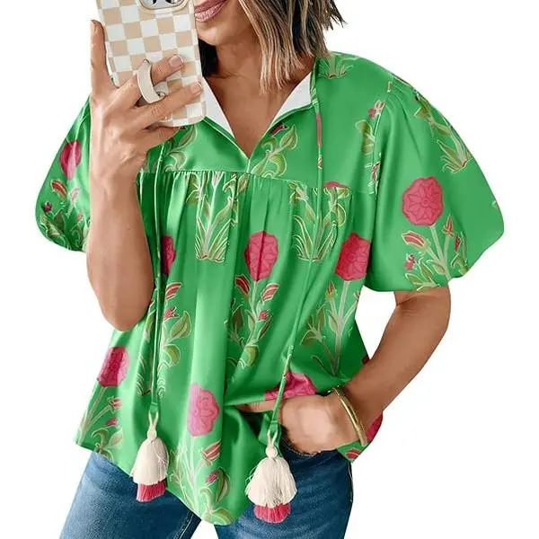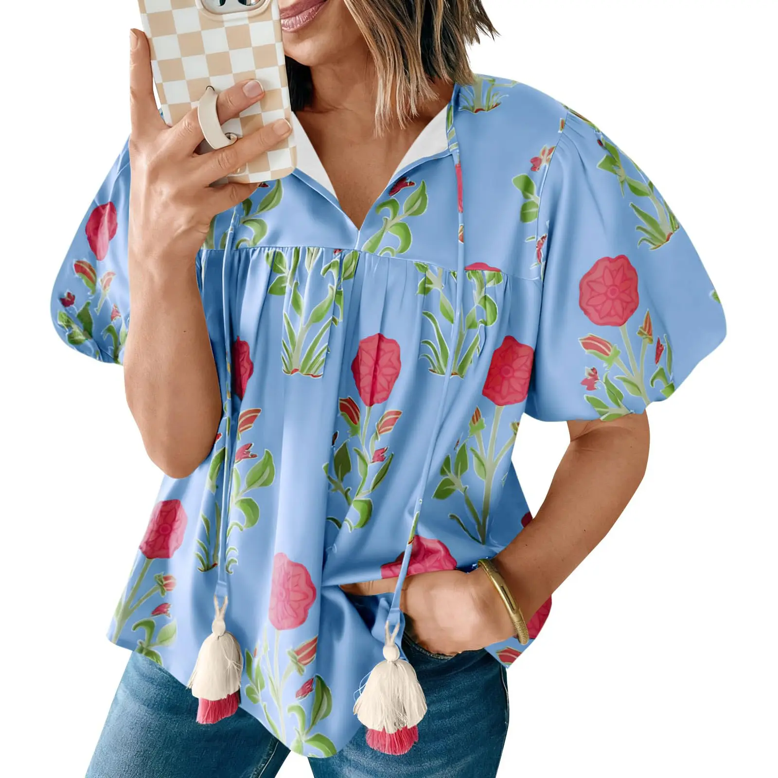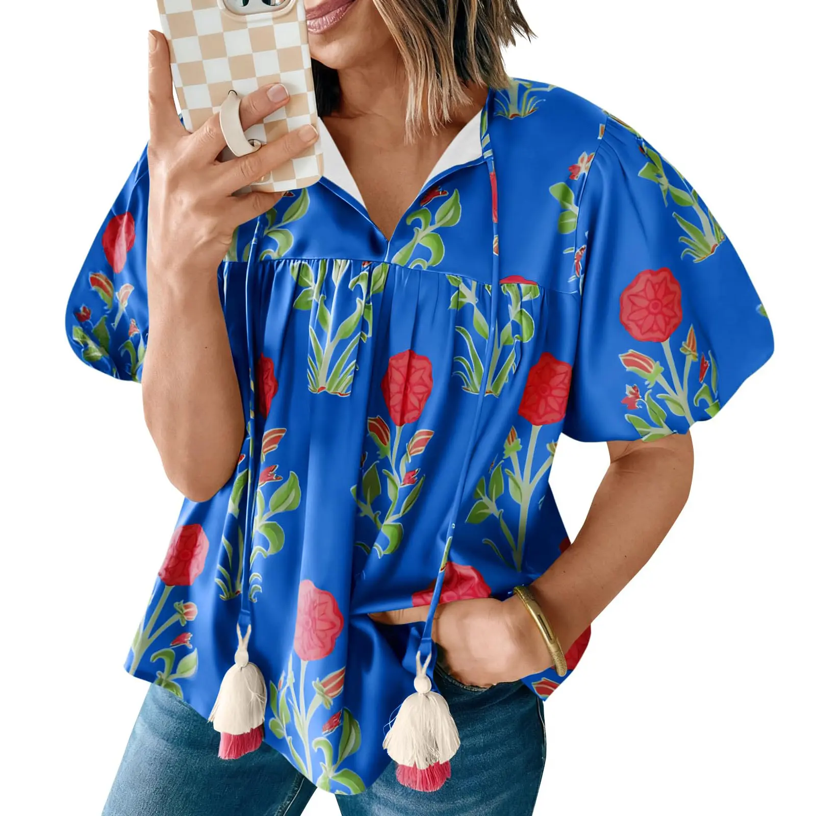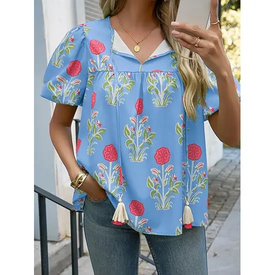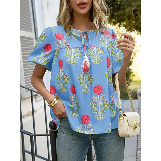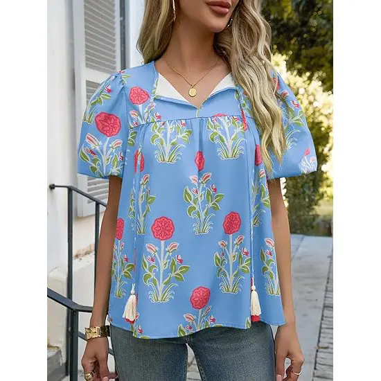 Design: Stay chic and comfy with the tassel-tie V-neck and short lantern sleeve. Loose blouses for women boast a unique floral print. The babydoll cut with pleated design flatters all body types, hiding the tummy while adding feminine charm