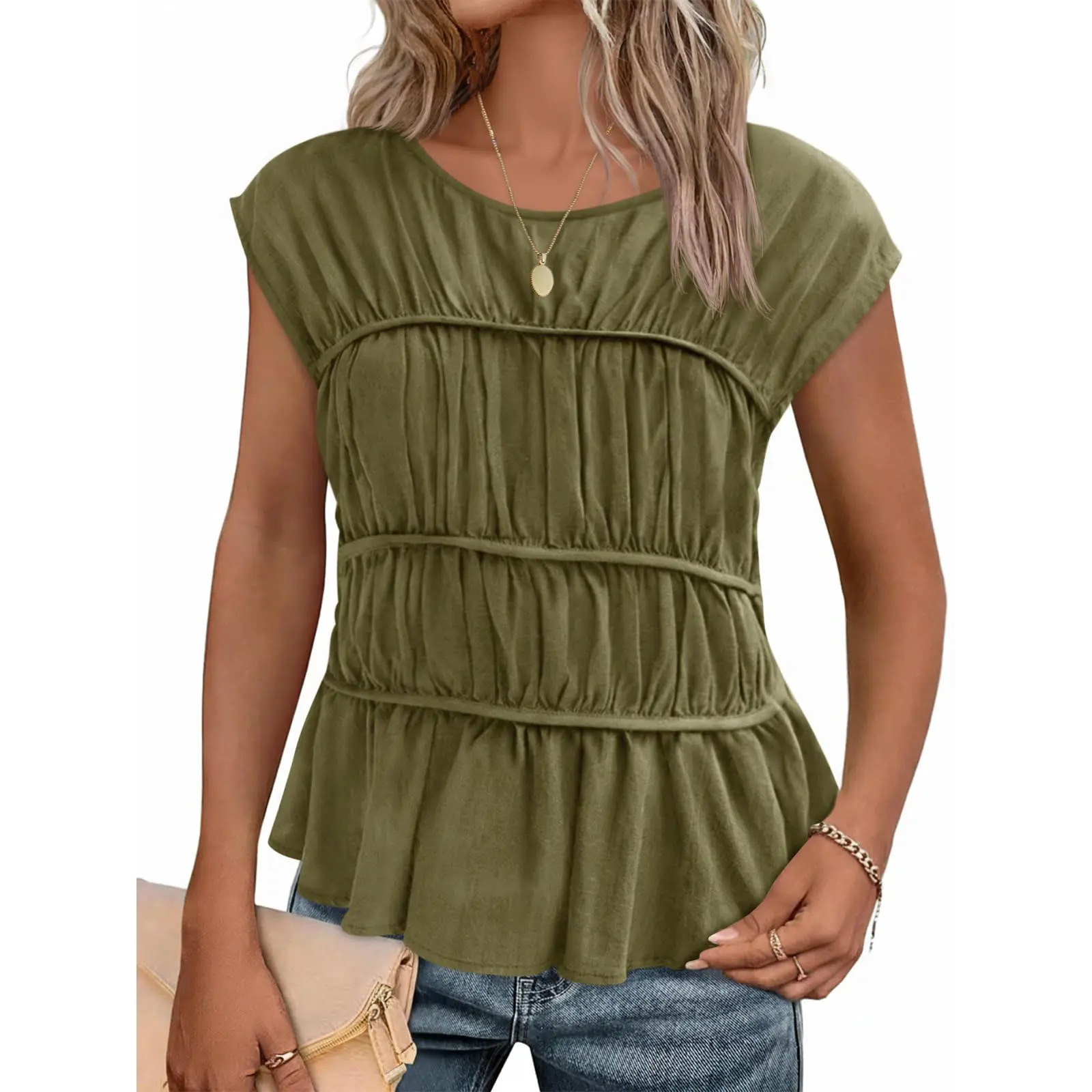 Unique Design: Featuring ruched details and a tiered shirred design, these cute crew neck blouses add a unique texture to your wardrobe, making them perfect for casual outings or special occasions