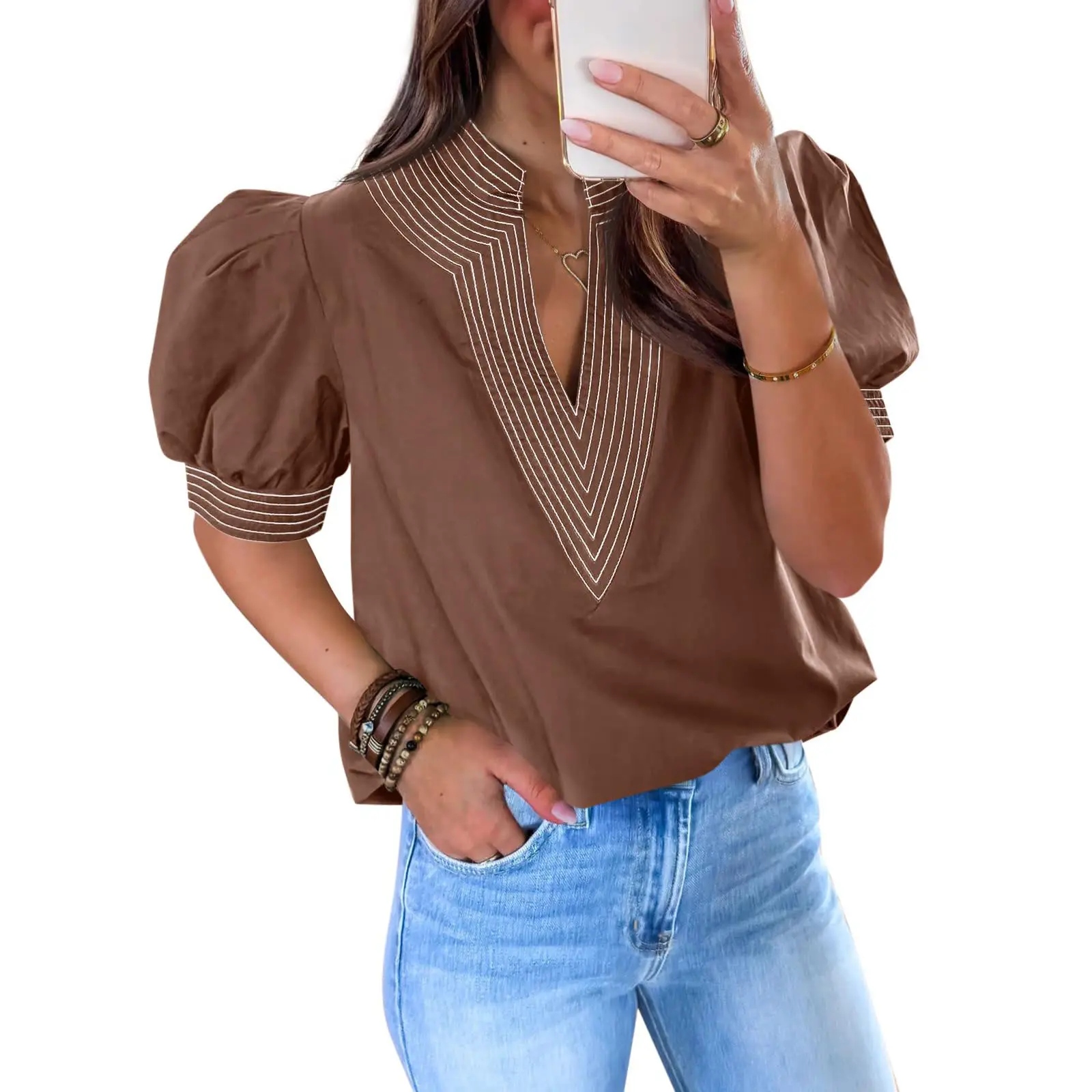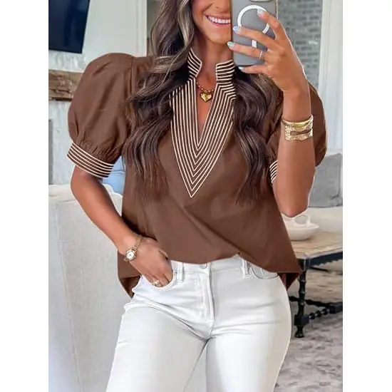 Features: Pleated puff sleeve tops, v neck shirts dressy casual, loose fit tops. Stylish and classic summer blouse