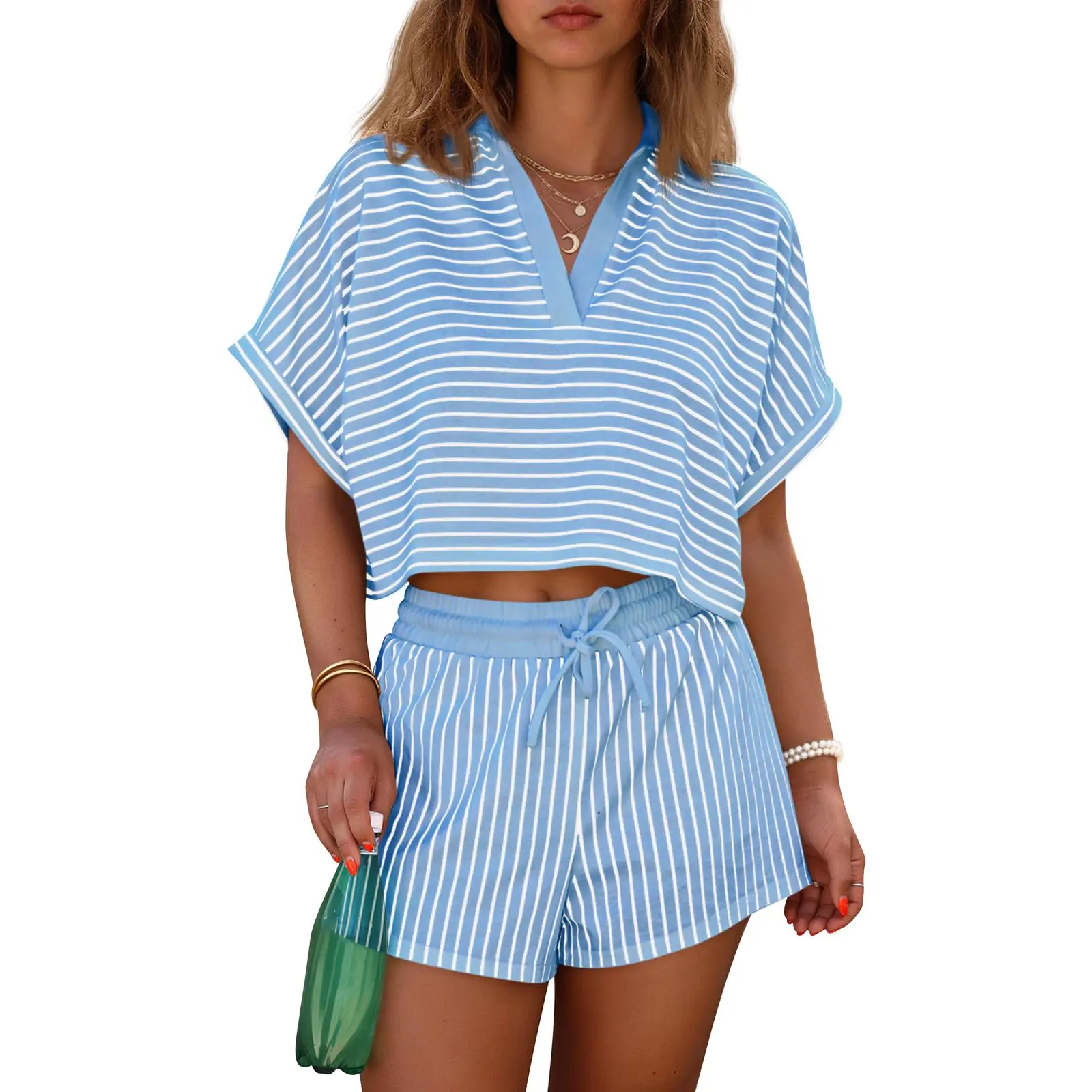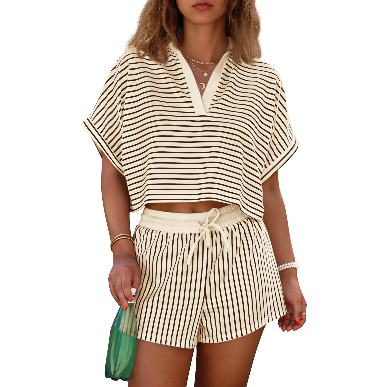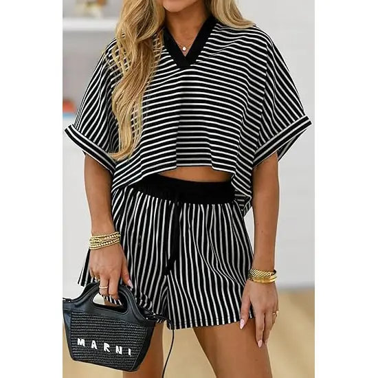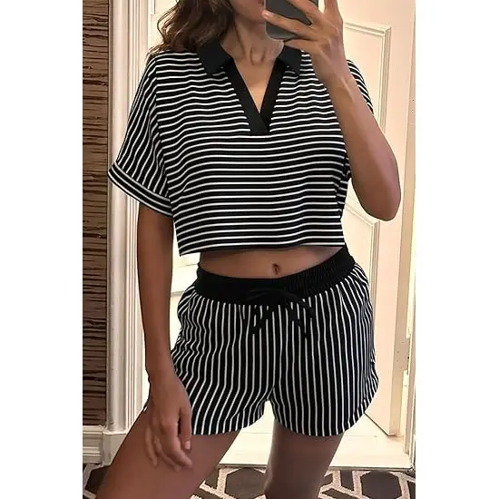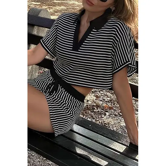 Stylish Striped Design: Our lightweight sets features a classic striped polo shirt paired with drawstring shorts. Eye-catching and versatile, perfect for casual outings or lounging at home, adding a chic touch to your everyday style