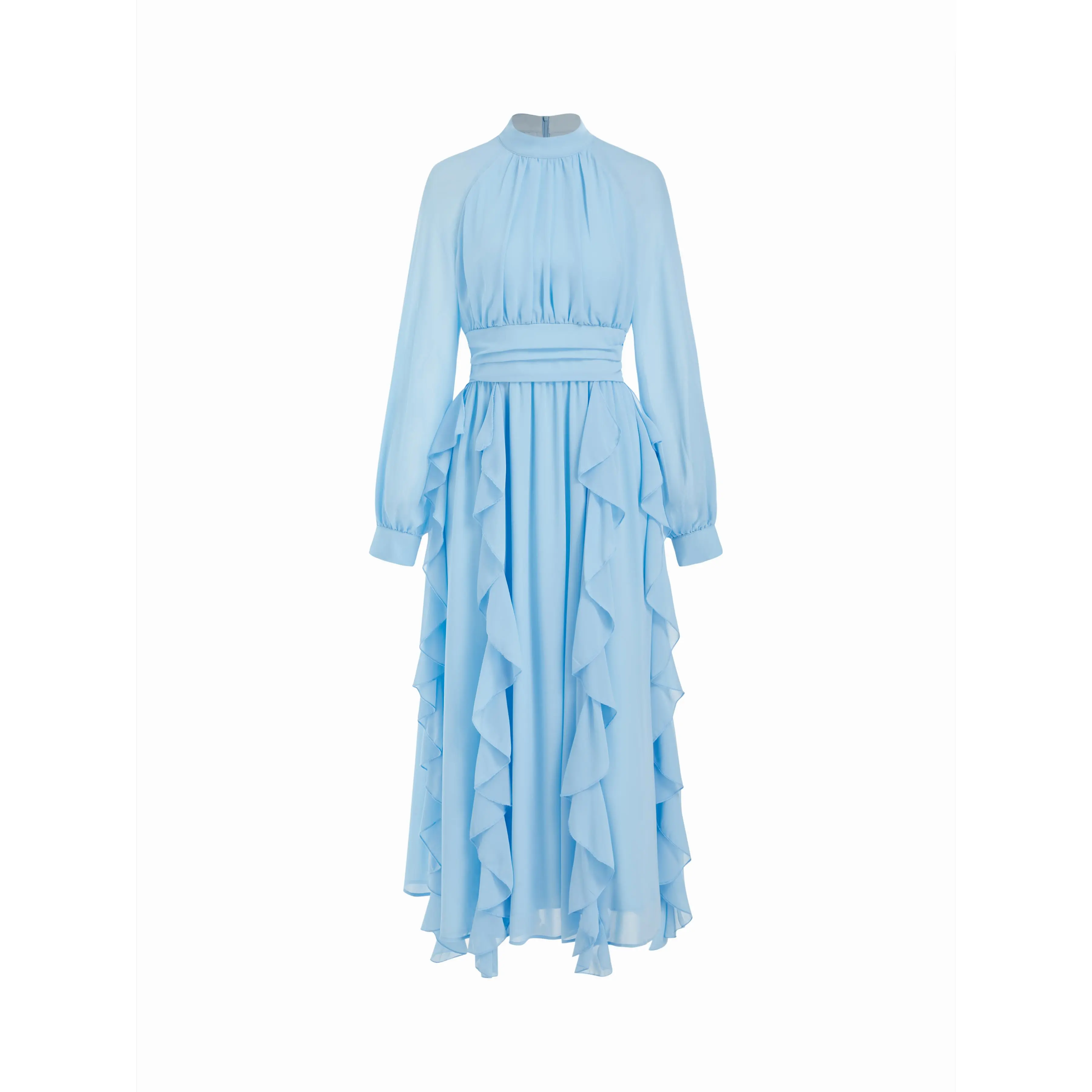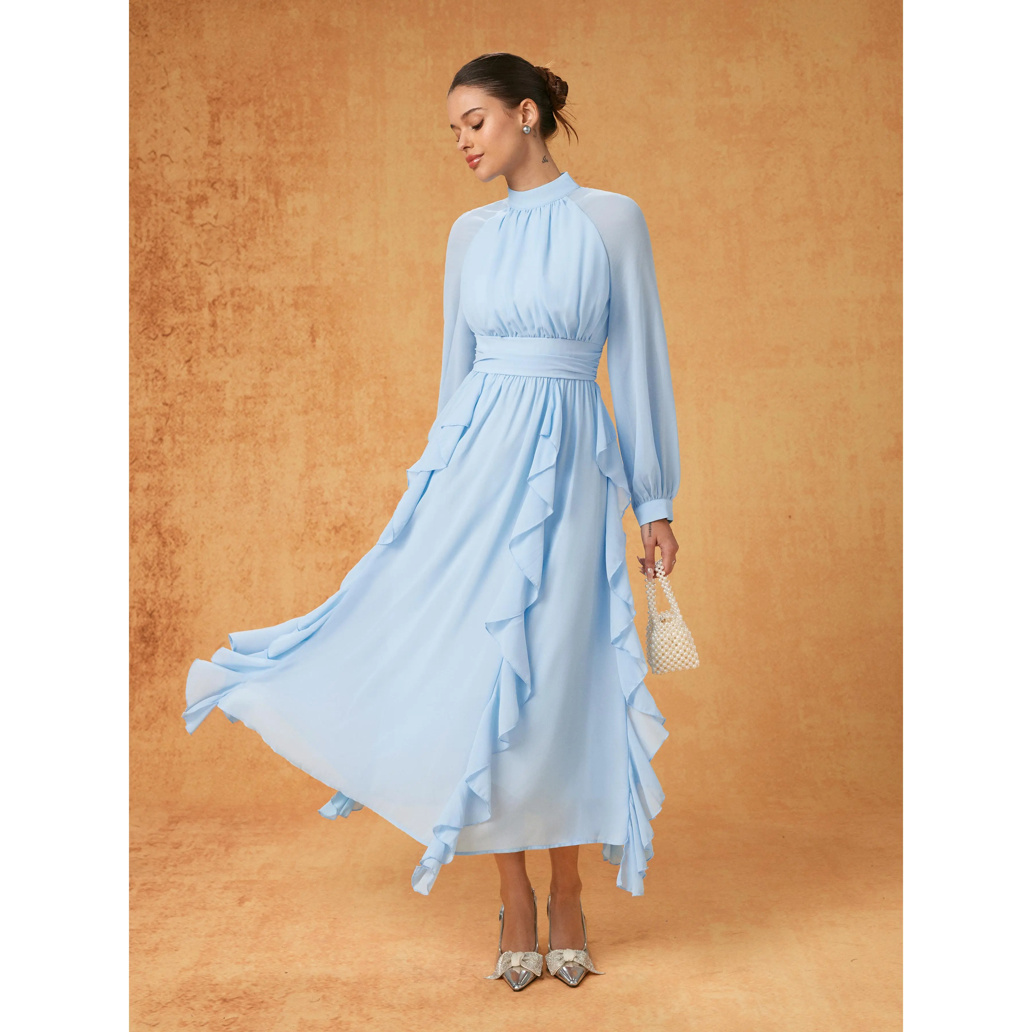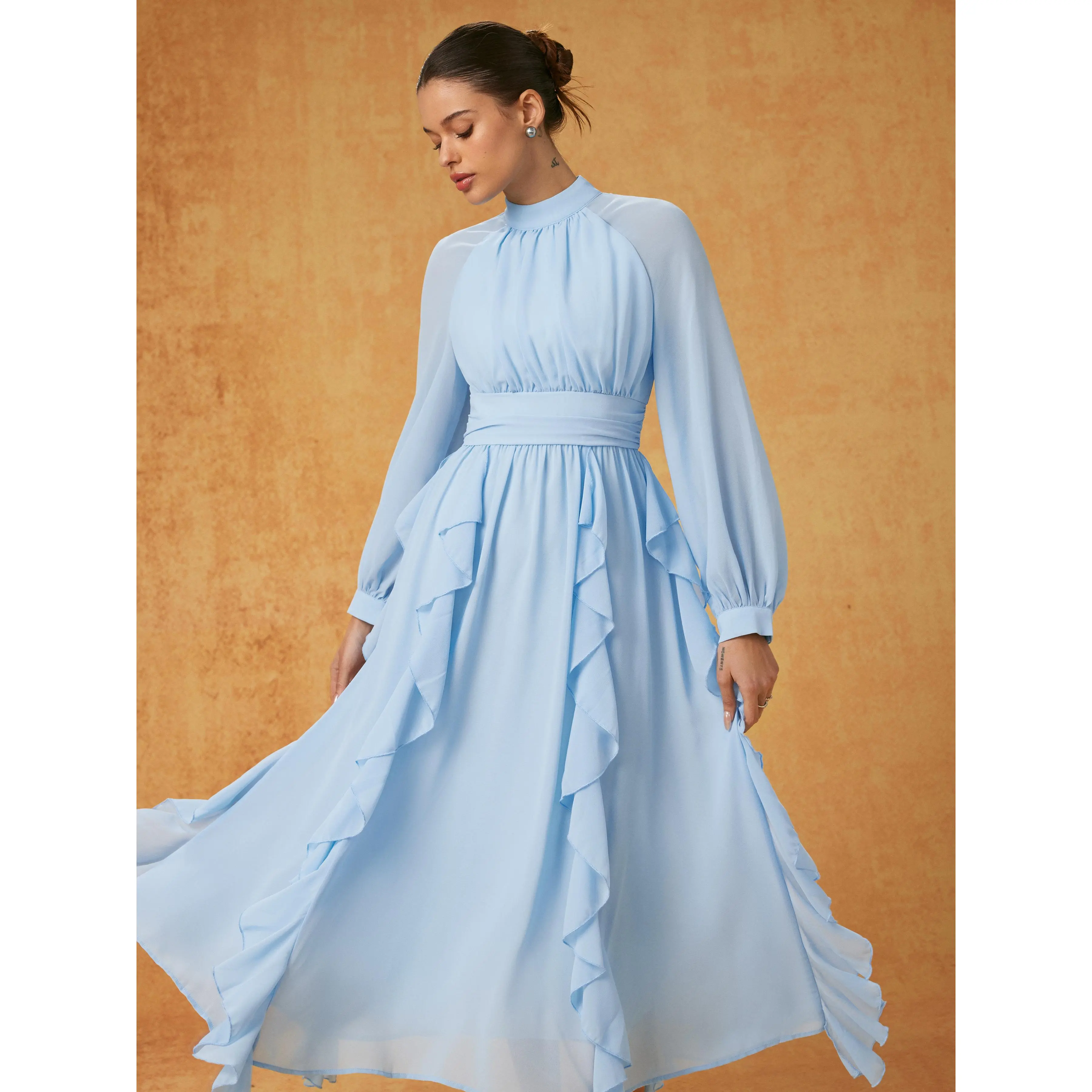 5. Cider Chiffon Stand Collar Ruffled Lantern Sleeve Flared Maxi Dress