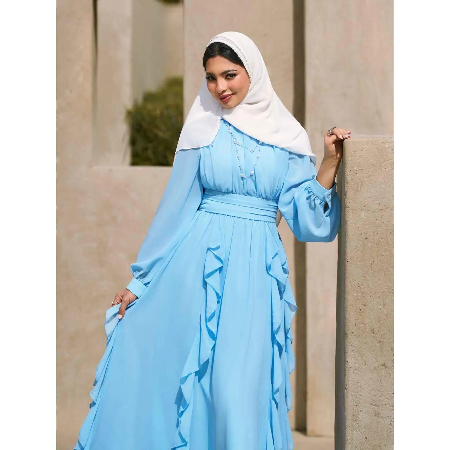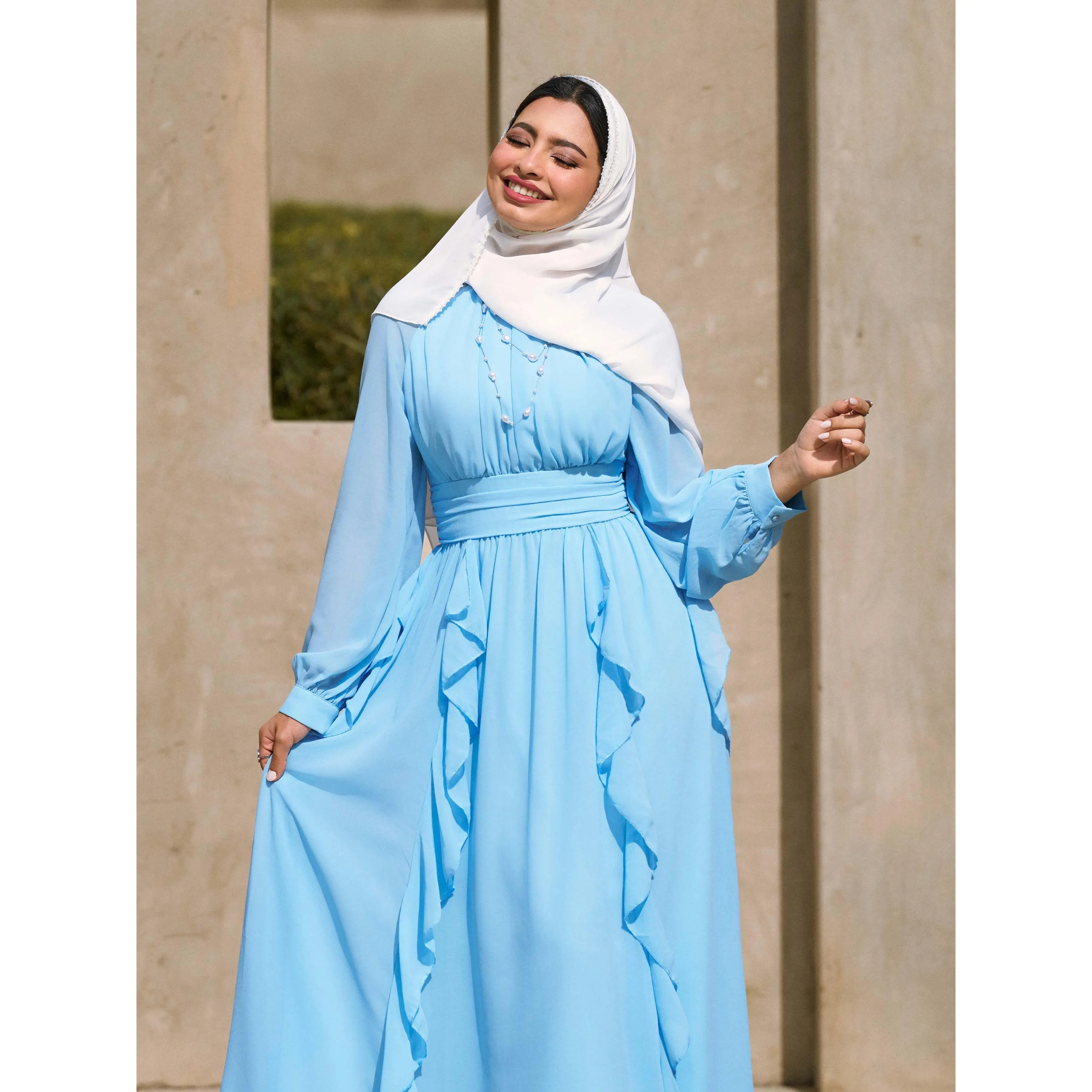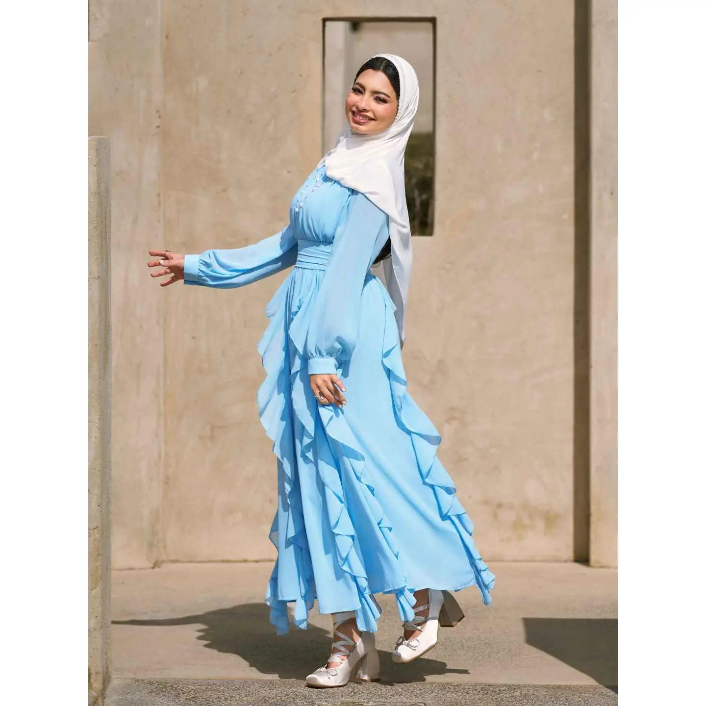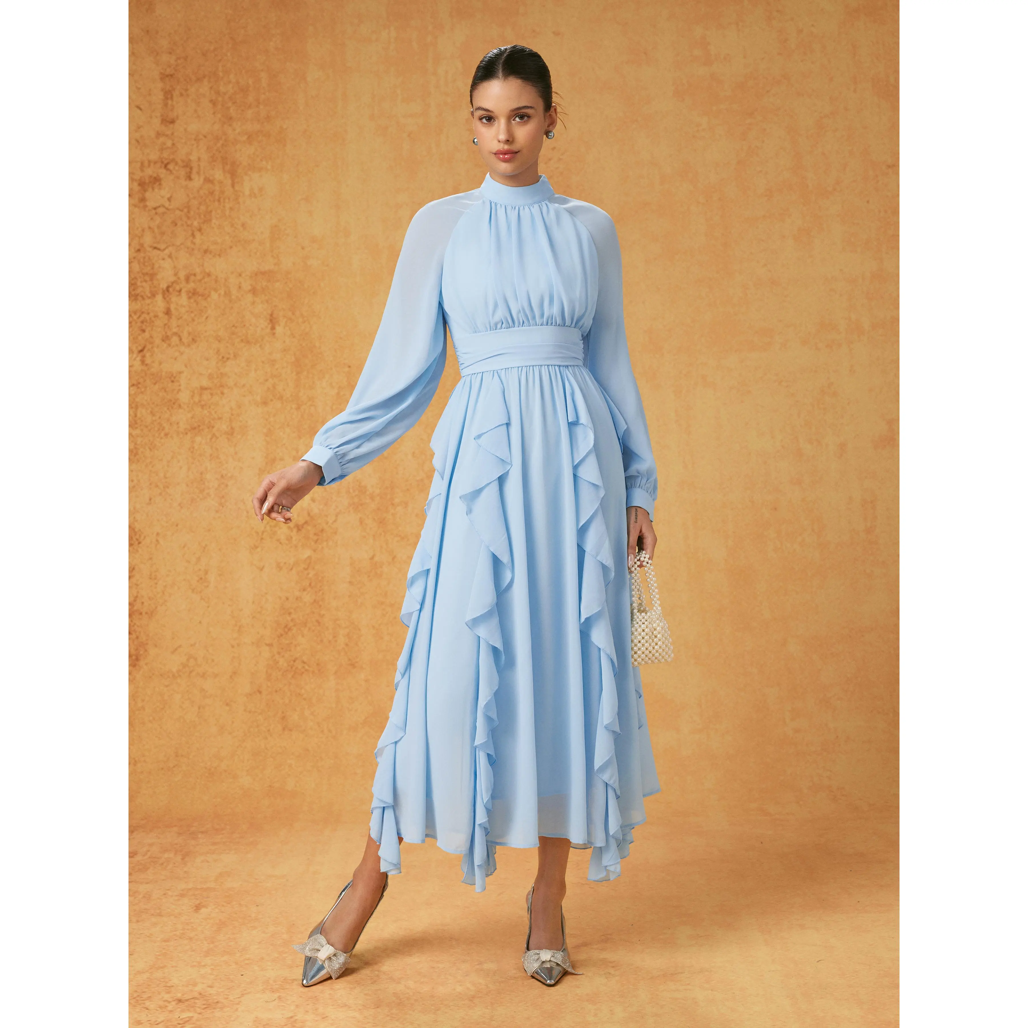 5. Cider Chiffon Stand Collar Ruffled Lantern Sleeve Flared Maxi Dress