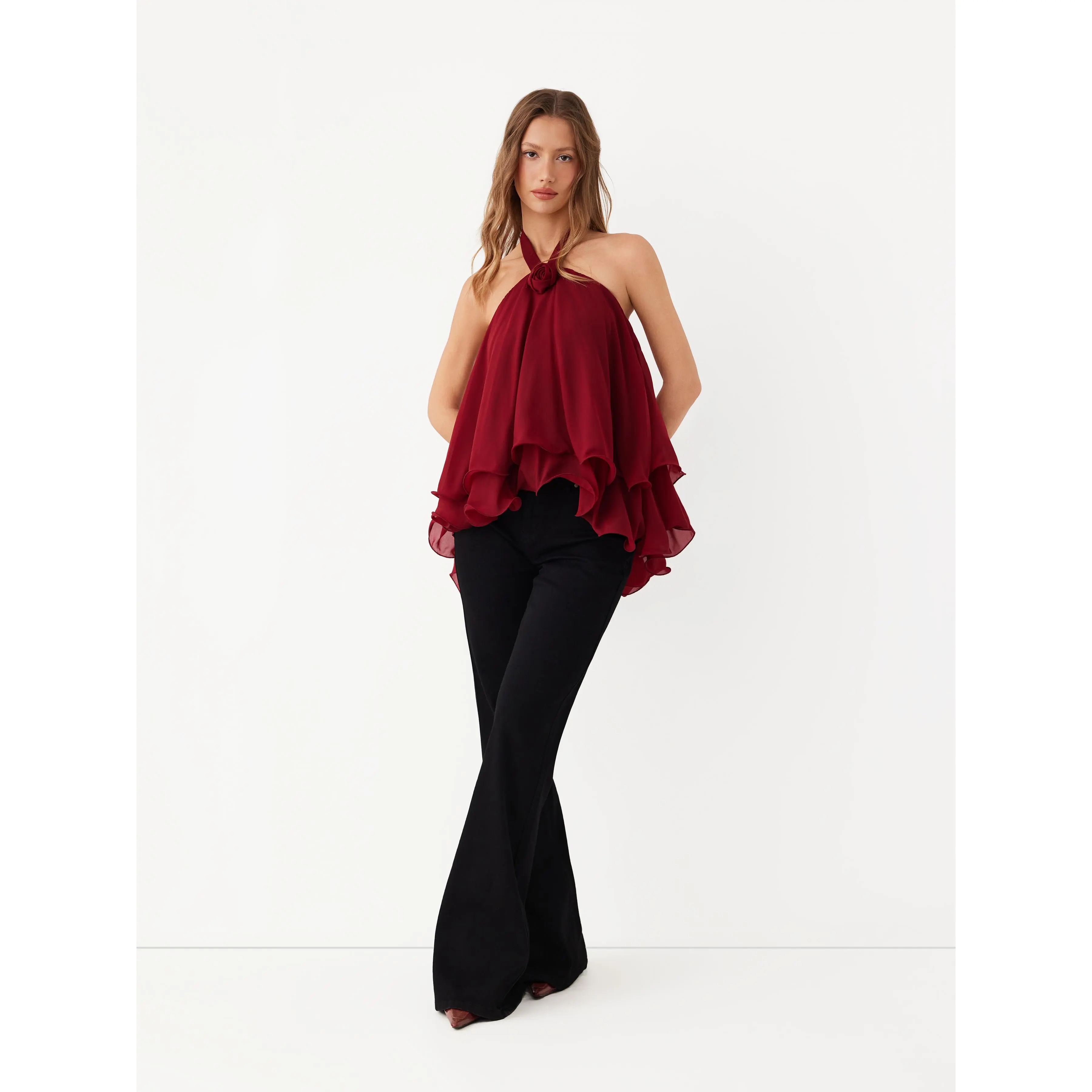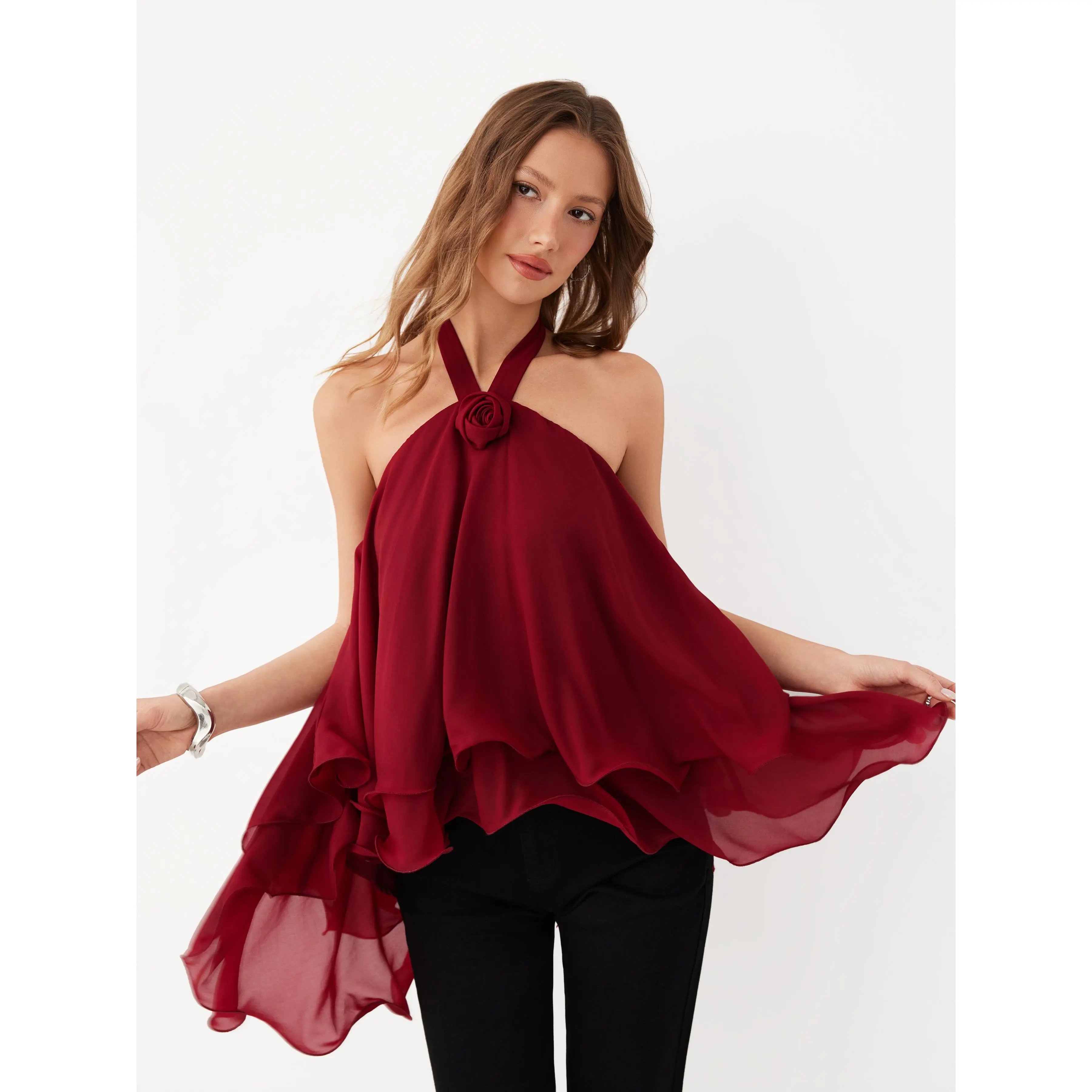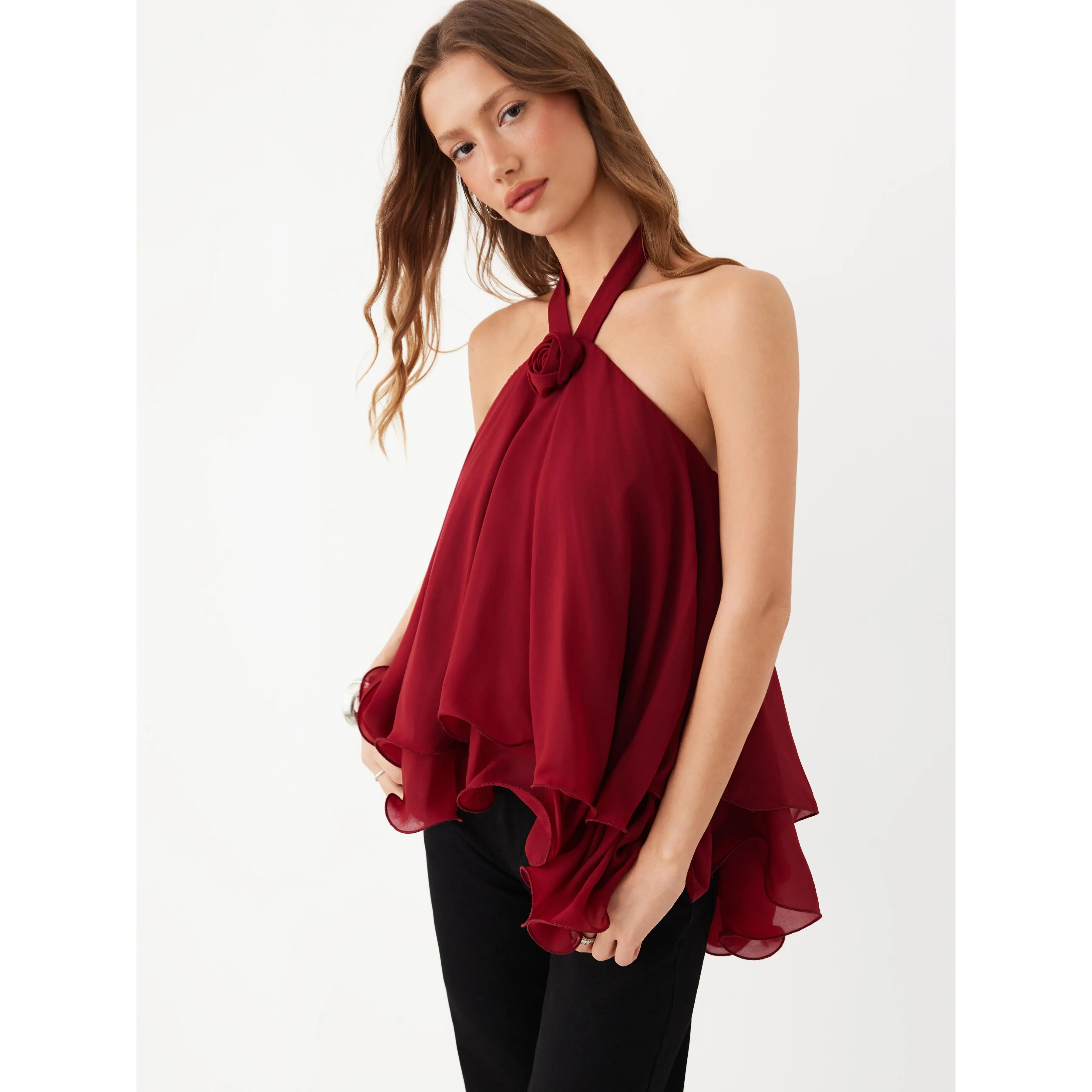 5. Cider Chiffon Halter Neck Rose Detail Ruffle Hem Oversized Blouse