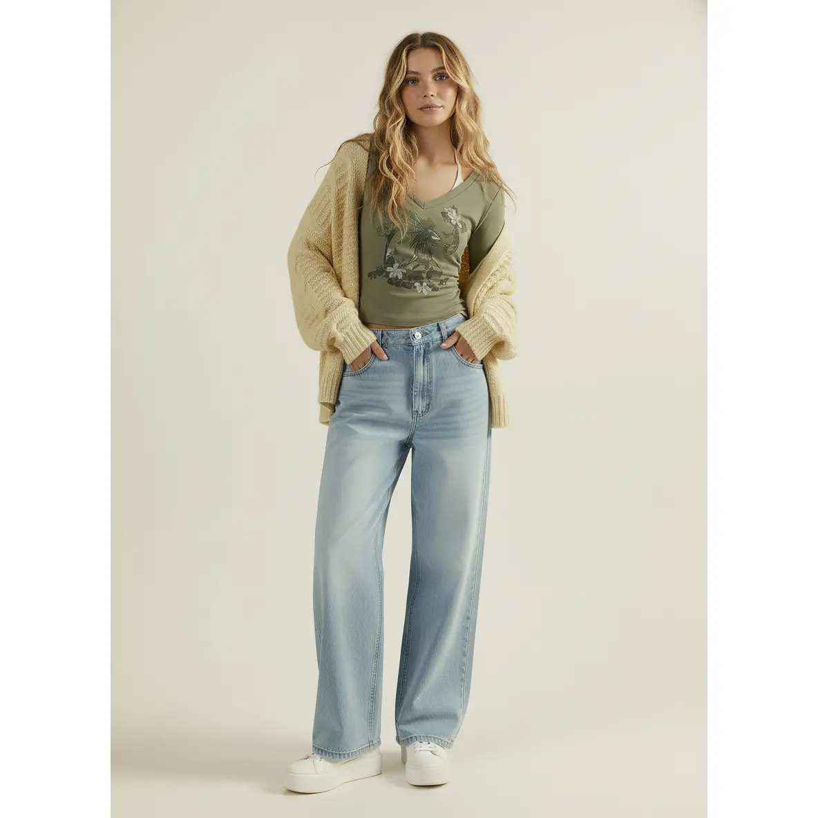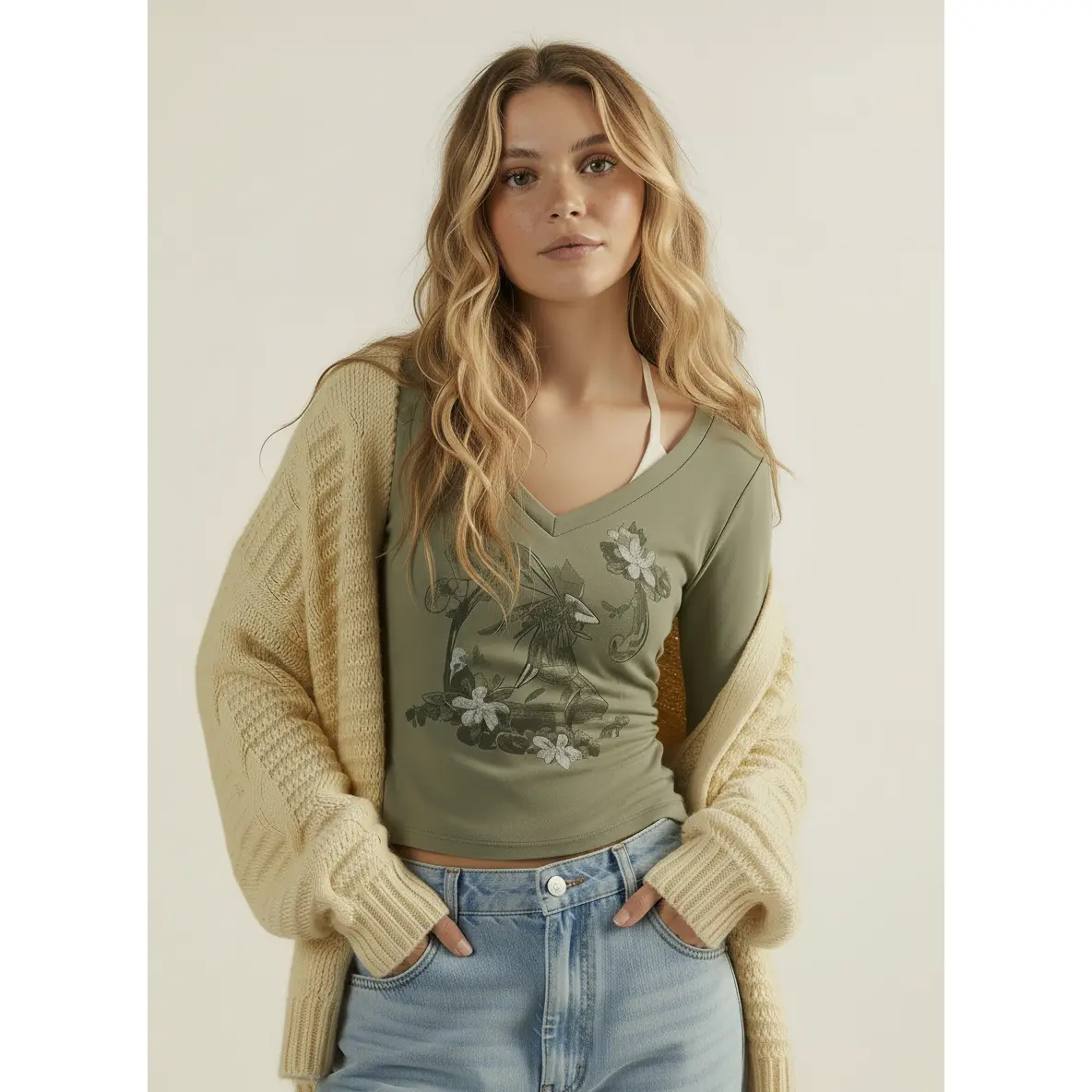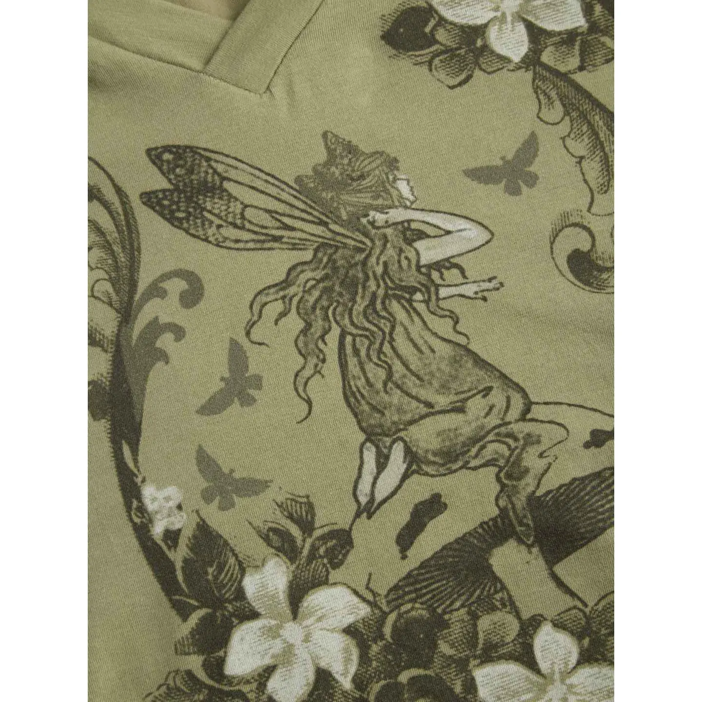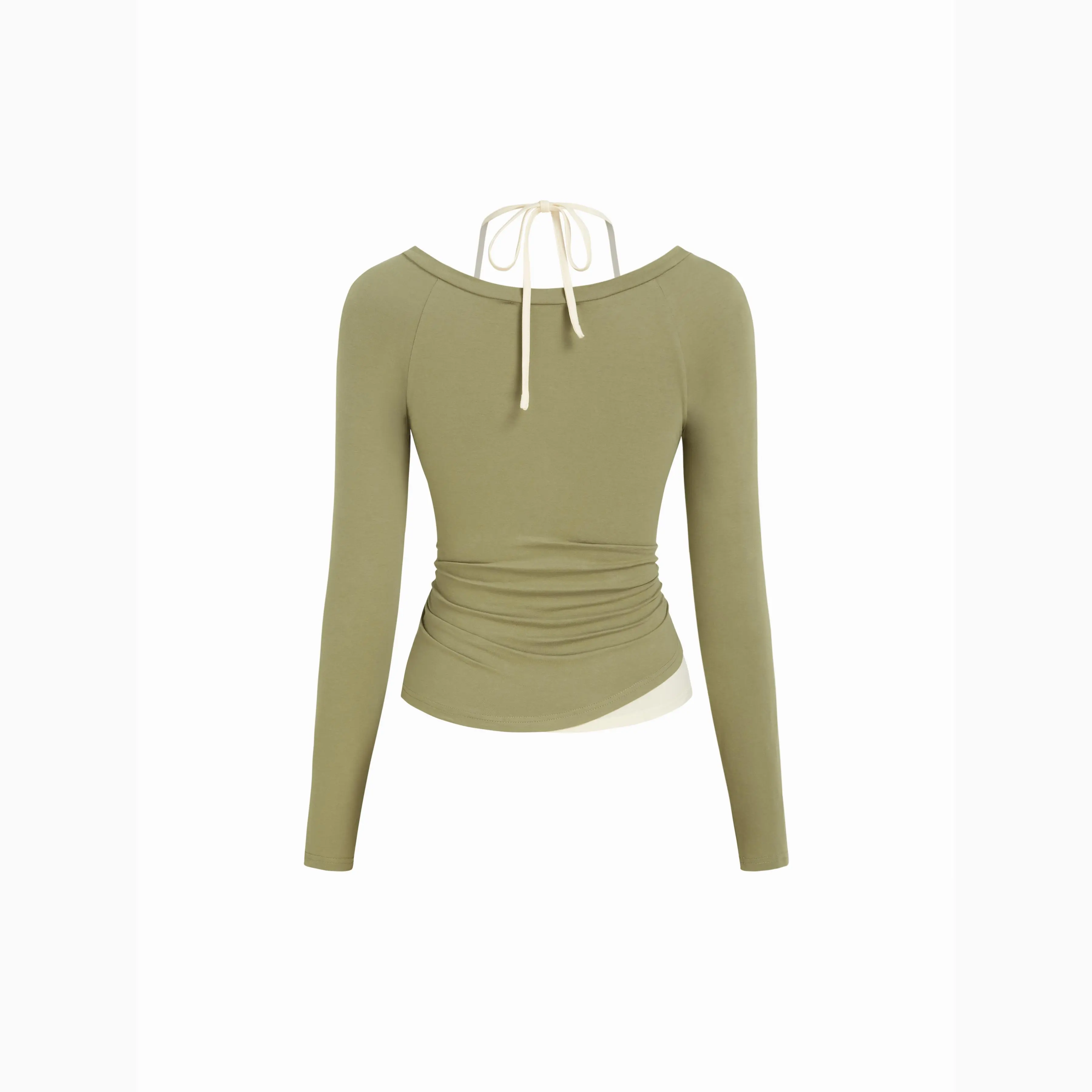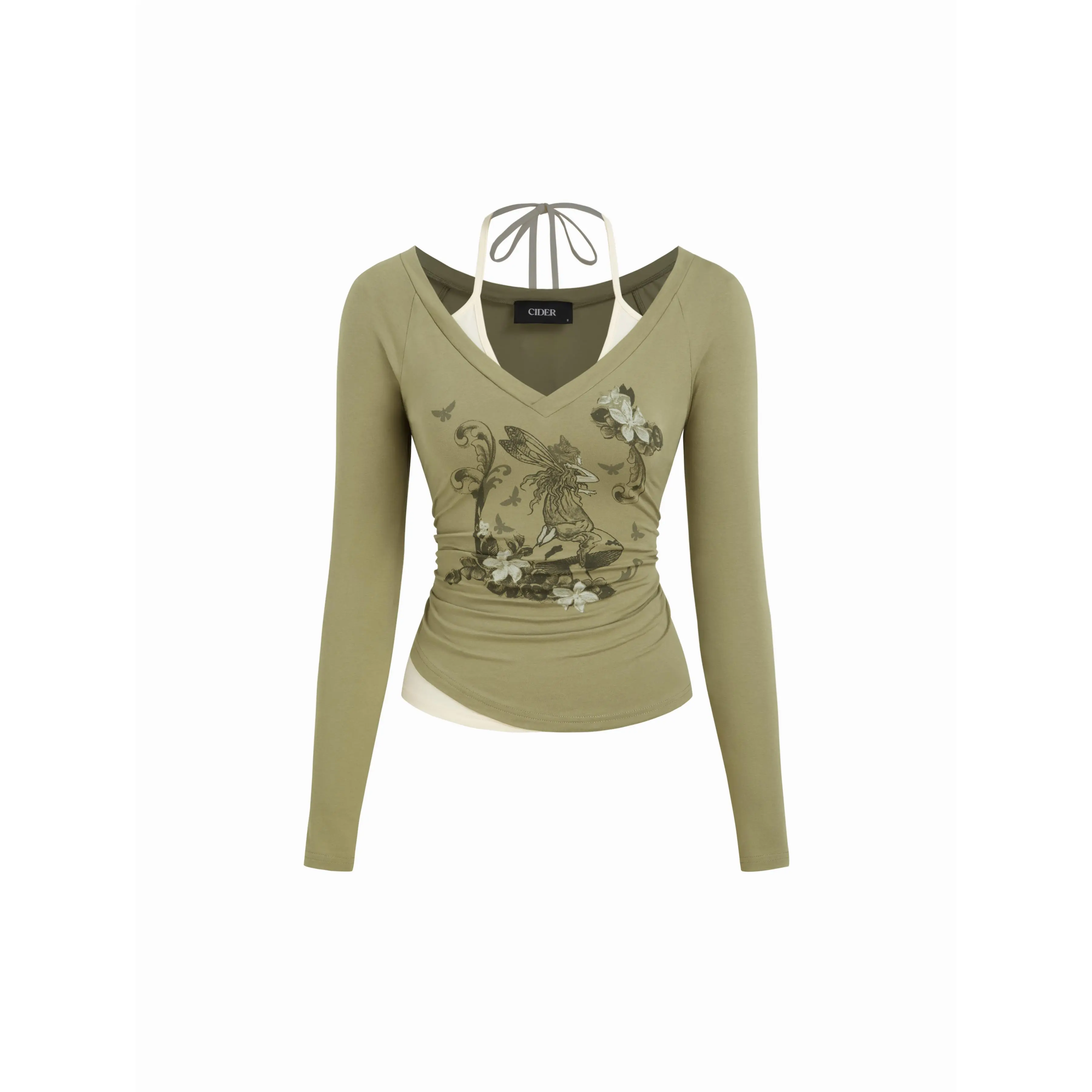 5. Cider Cotton-blend V-neck Graphic Ruched Long Sleeve Tee